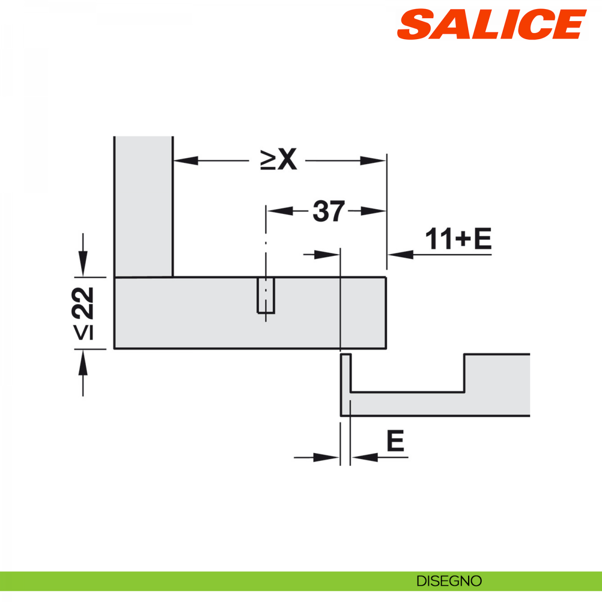 Cerniera Salice C7A6NE9 Serie Silentia+ controcollo per piccoli spazi, per ante in legno con apertura 110 gradi, diametro foratura 35 mm, con ammortizzatore regolabile integrato nella gabbia della cerniera.