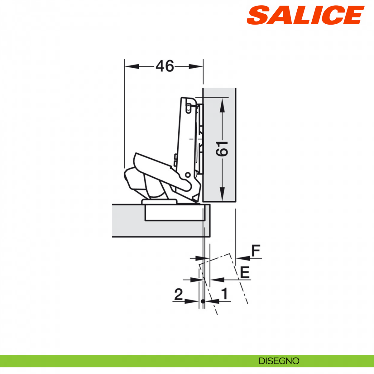 Cerniera Salice CBA2AE9 Serie Universali, per ante in legno con applicazione standard, sagomate e battute doppie con apertura 110 gradi, diametro foratura 35 mm, chiusura ammortizzata.