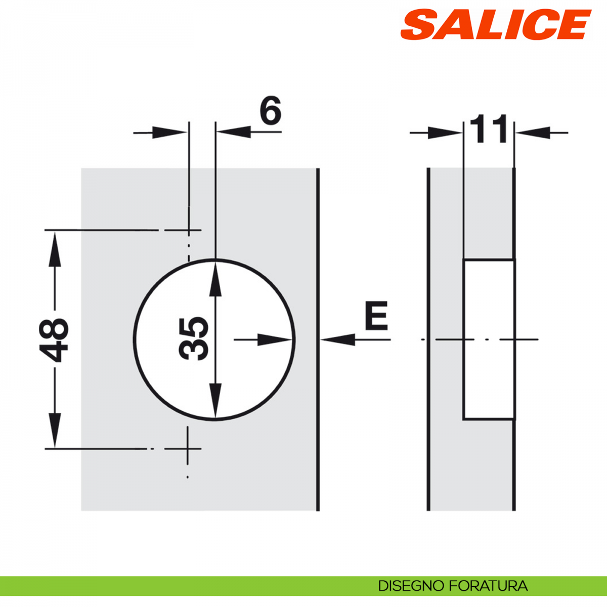 Cerniera Salice C2ABE99 Serie 200 forti spessori, per ante in legno con apertura 94 gradi con applicazione angolare positiva 30 gradi mezzo sormonto, diametro foratura 35 mm, per ante con spessore massimo 35 mm, chiusura automatica.
