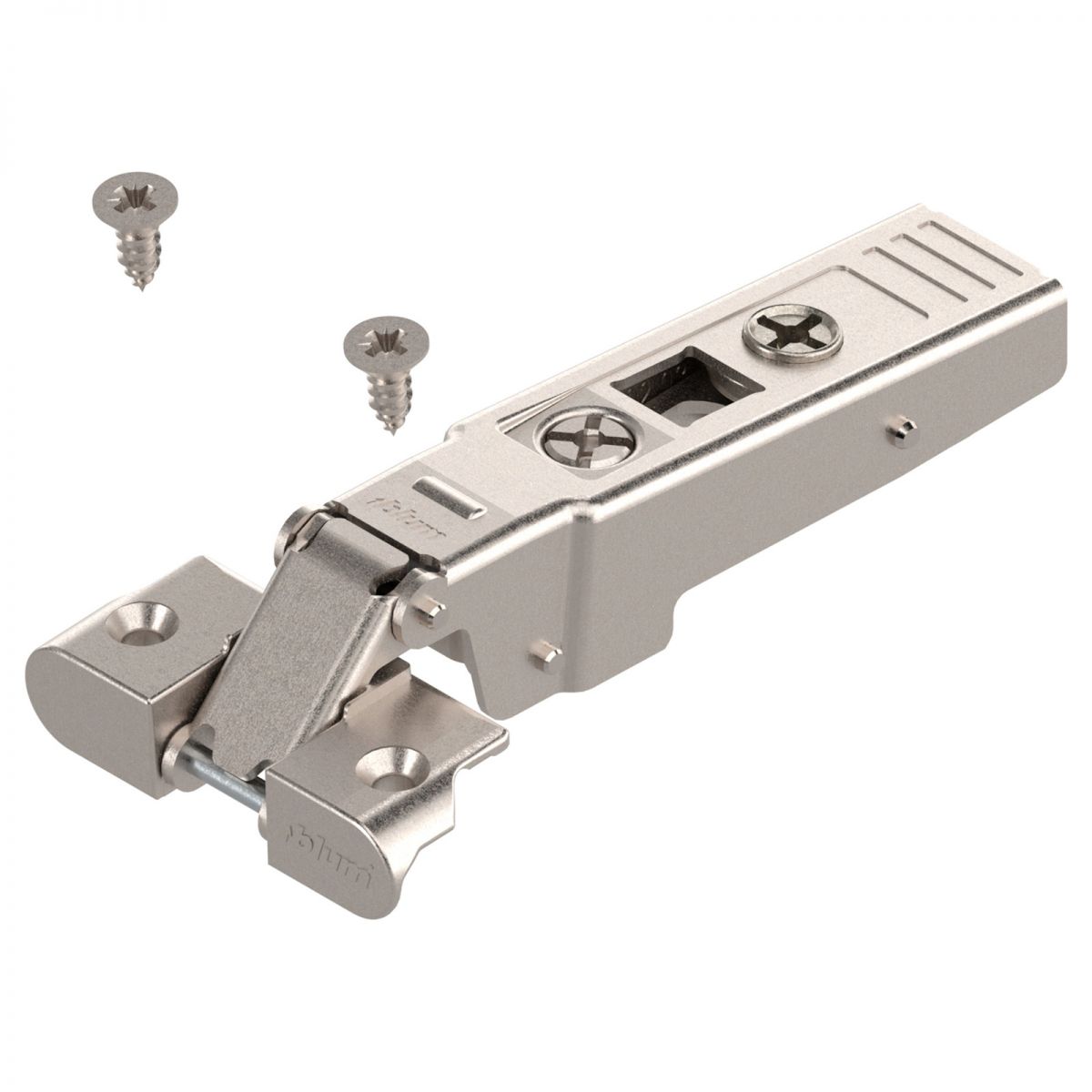 Cerniera Blum 71T960A serie Clip Top, per ante con telaio in alluminio stretto fino a 22 mm di larghezza, con autoscatto (molla), per ante a mezza battuta, angolo di apertura 95°, con fissaggio a viti.