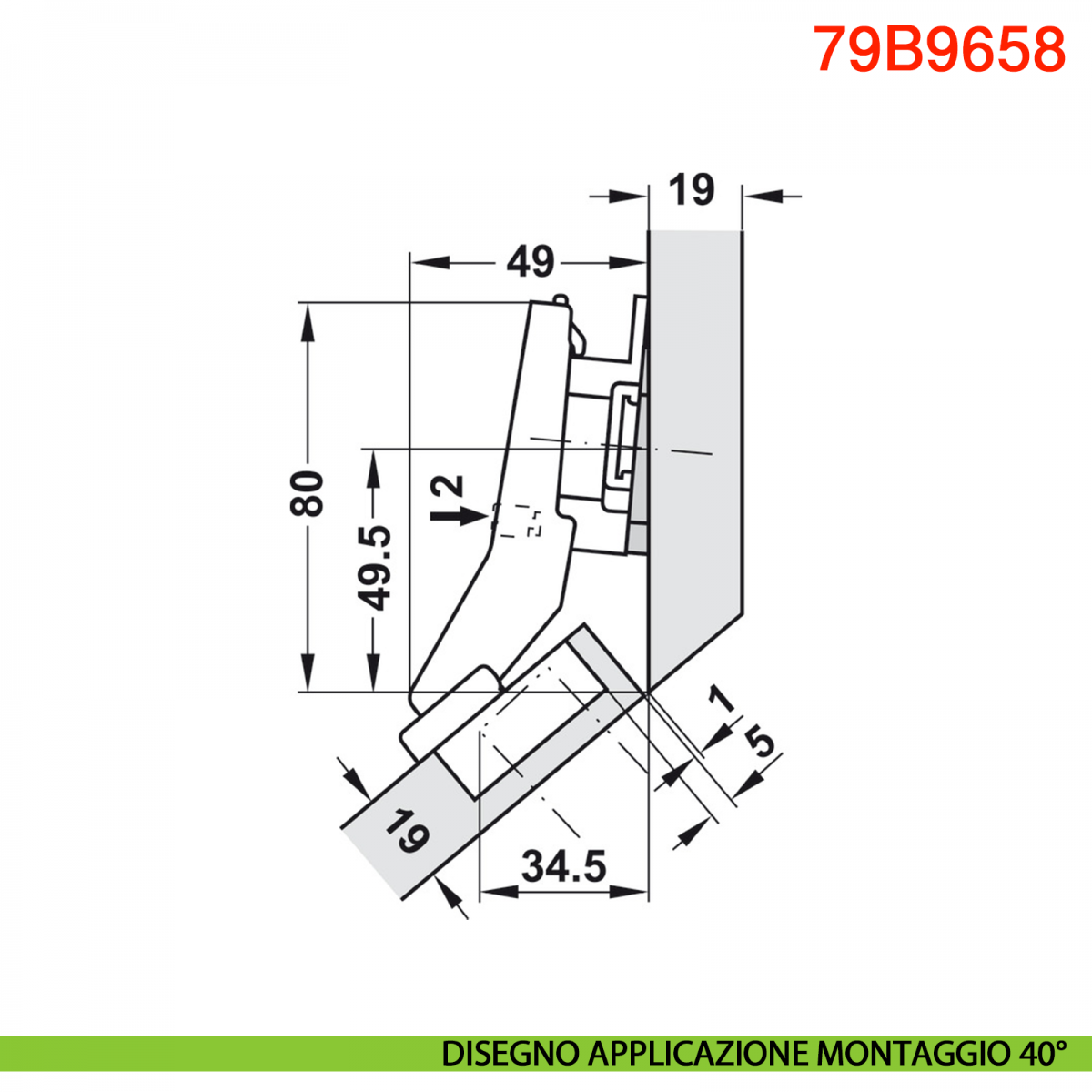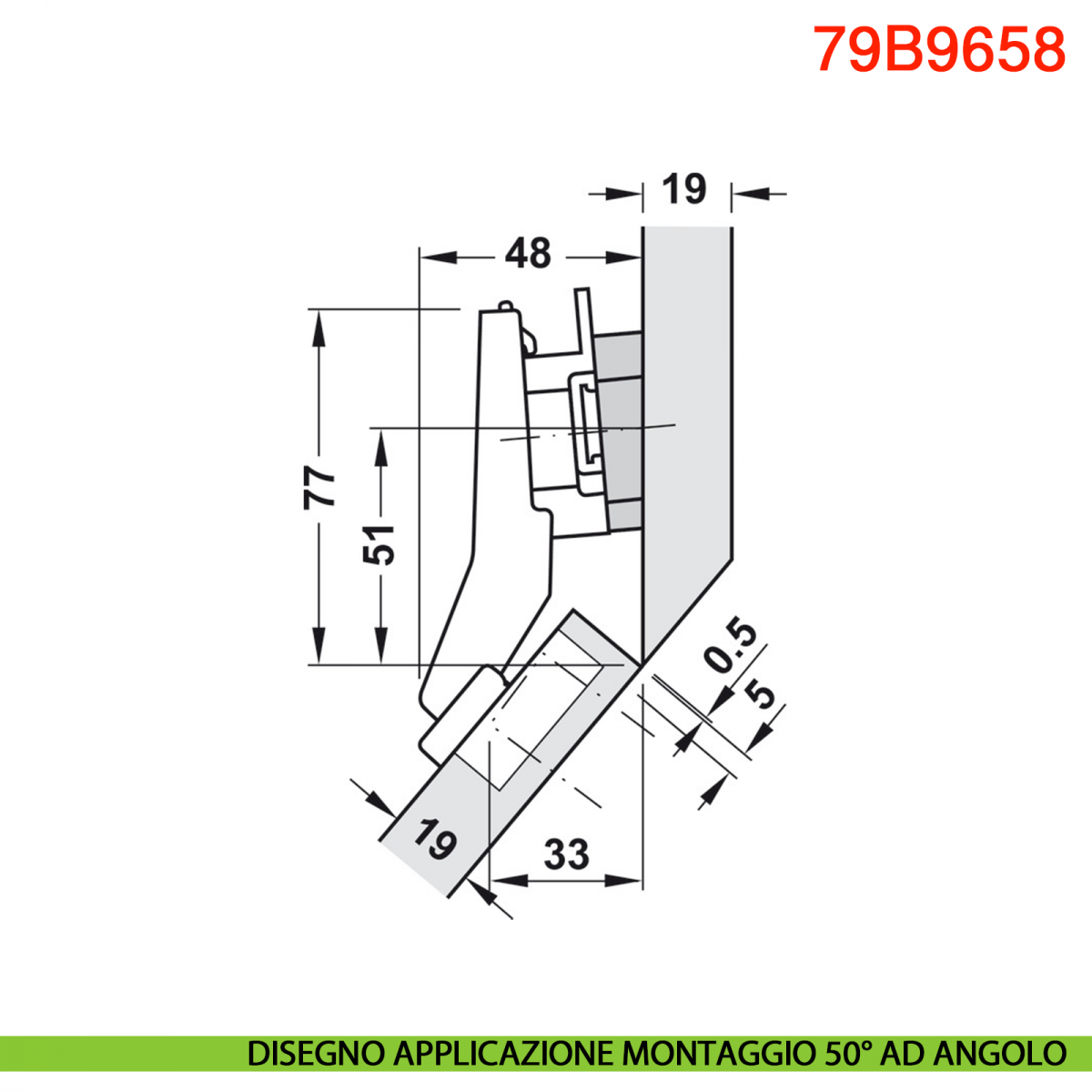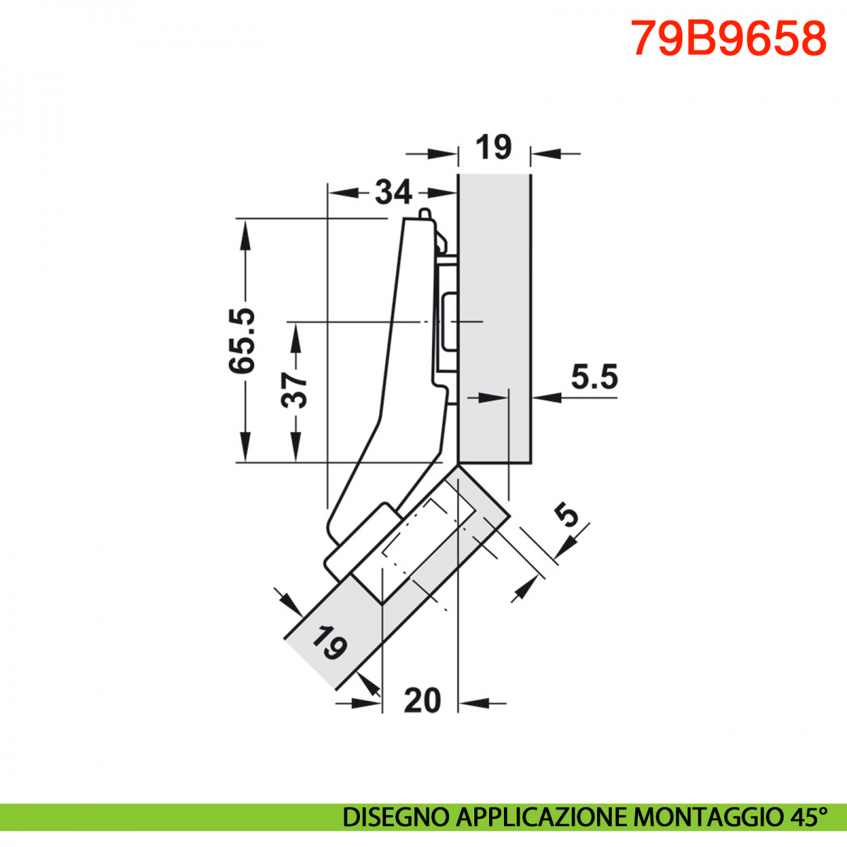 Cerniera Blum 79B9658 serie Clip Top Blumotion, per mobili ad angolo +45° I mezza battuta a sormonto, con ammortizzatore Blumotion incorporato, angolo di apertura 95°, con fissaggio a viti.