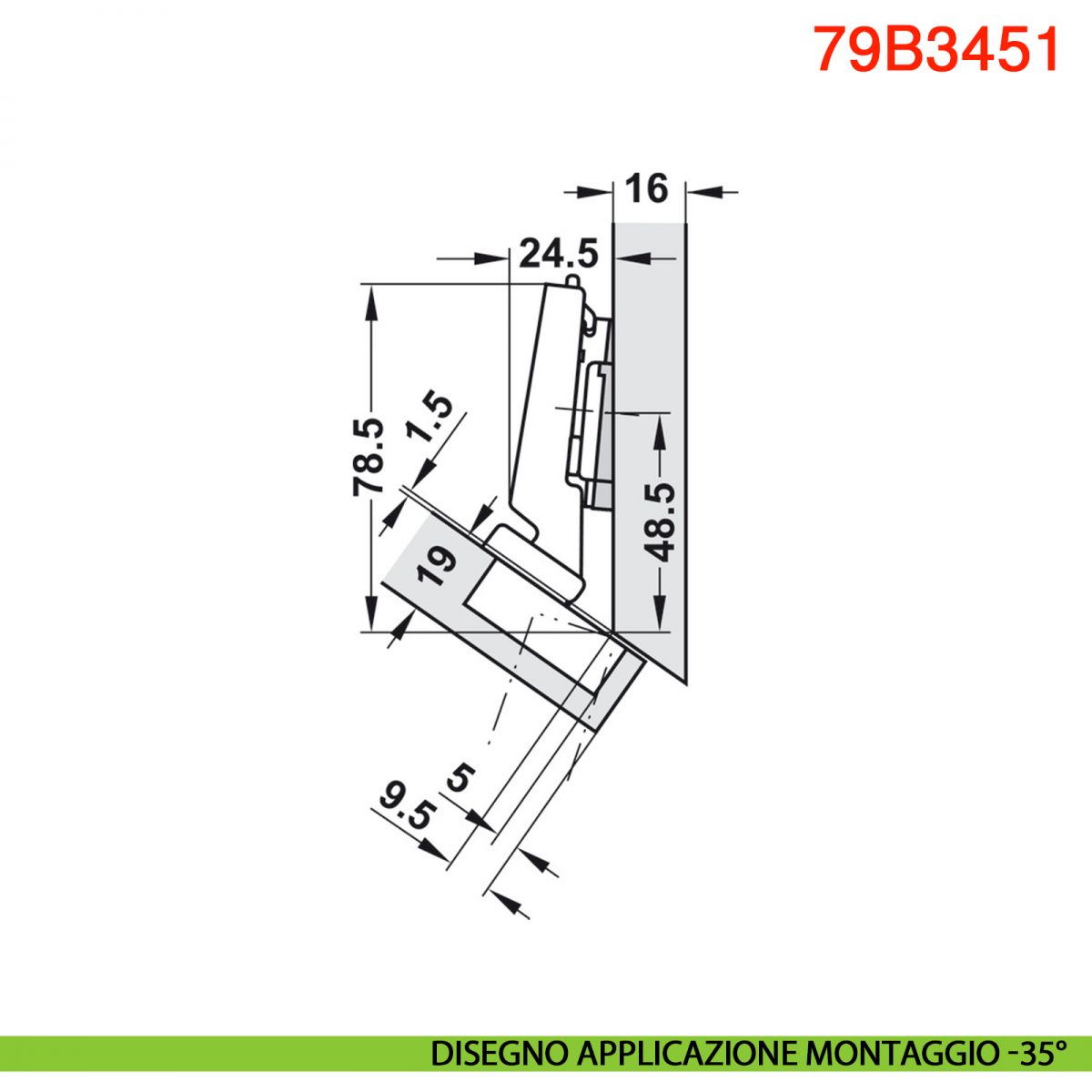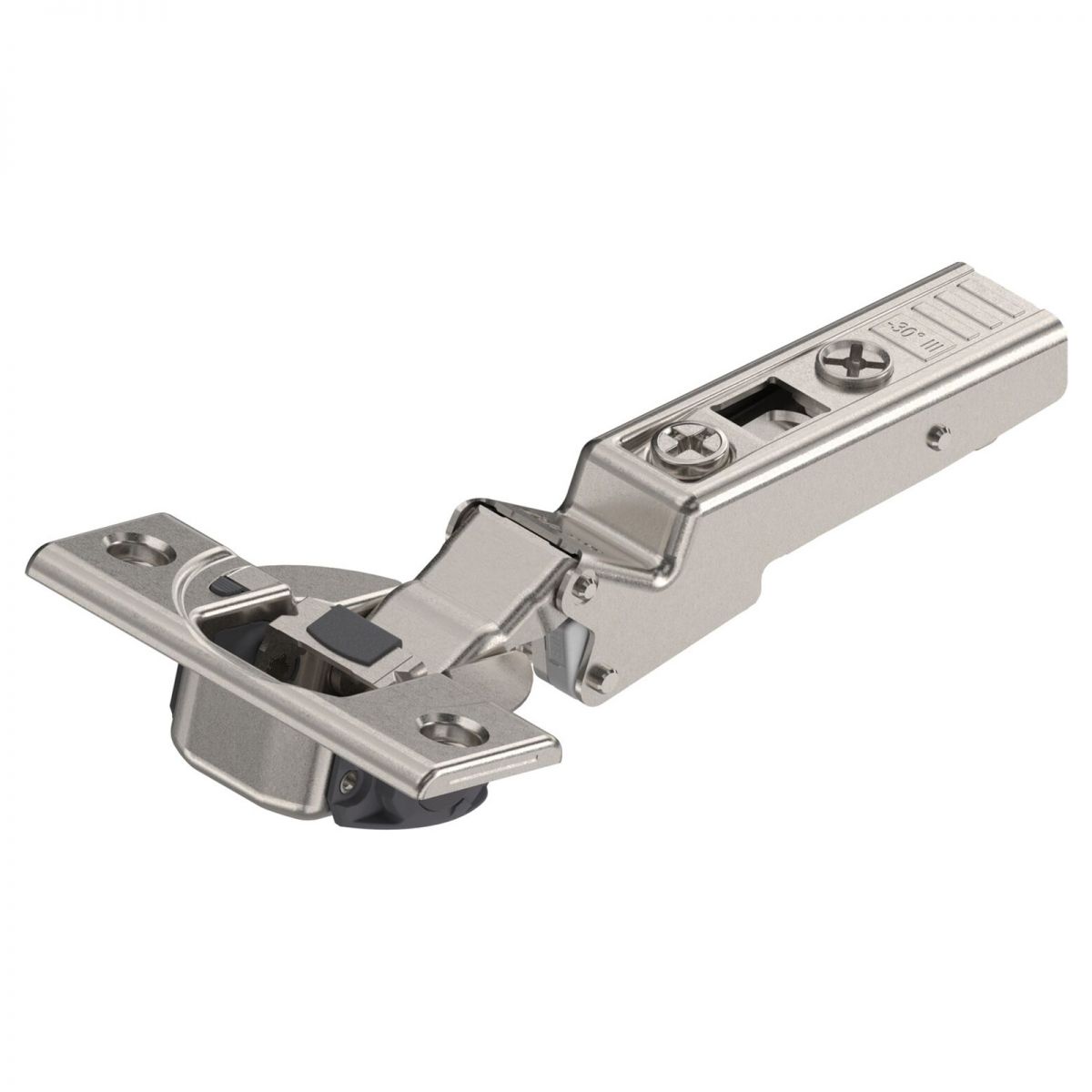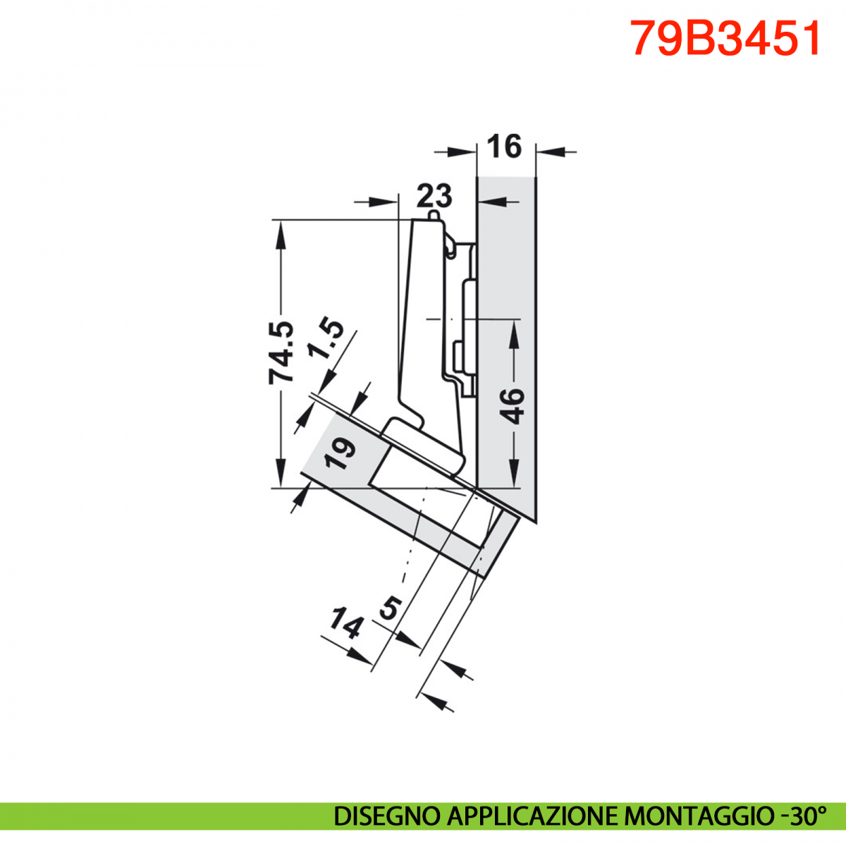 Cerniera Blum 79B3451 serie Clip Top Blumotion, per mobili ad angolo -30° III battuta a sormonto massima, con ammortizzatore Blumotion incorporato, angolo di apertura 110°, con fissaggio a viti.