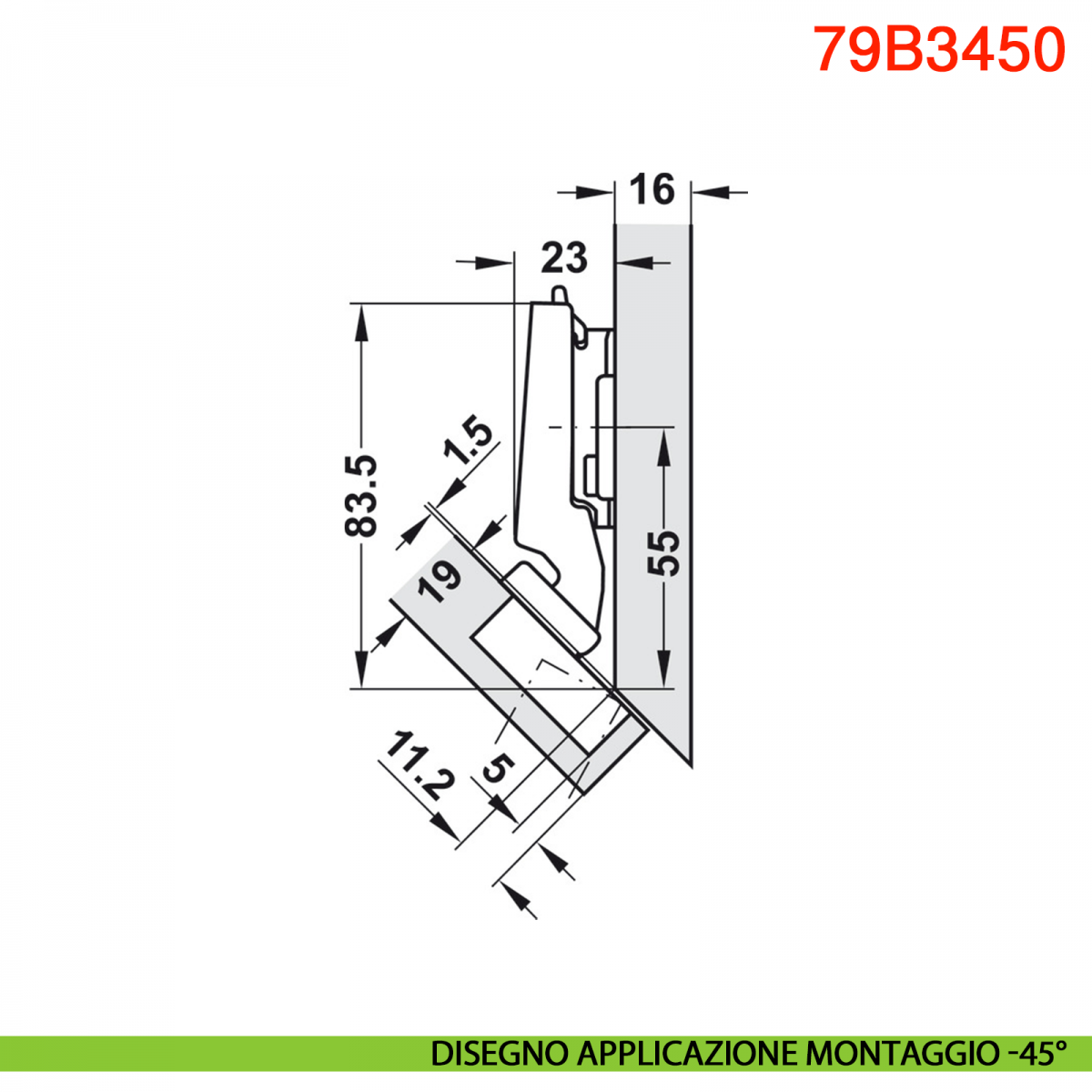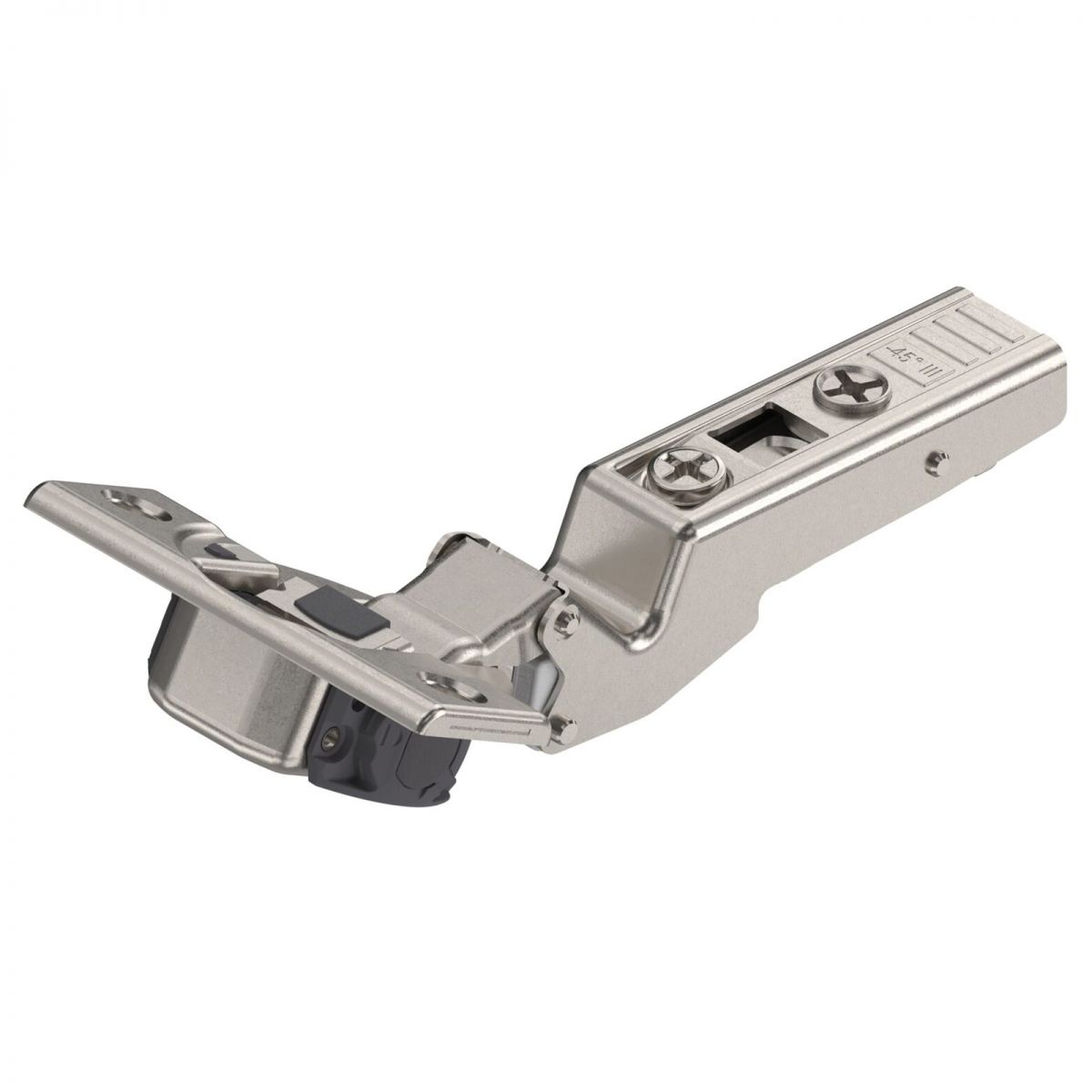 Cerniera Blum 79B3450 serie Clip Top Blumotion, per mobili ad angolo -45° III battuta a sormonto massima, con ammortizzatore Blumotion incorporato, angolo di apertura 110°, con fissaggio a viti.
