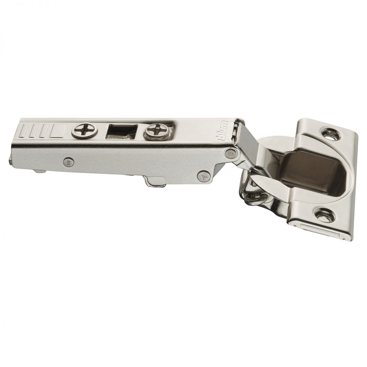 Cerniera Blum 70T3750.TL serie Clip Top, per ante battuta interna, senza molla (chiusura libera), angolo di apertura 110°, con fissaggio a viti.