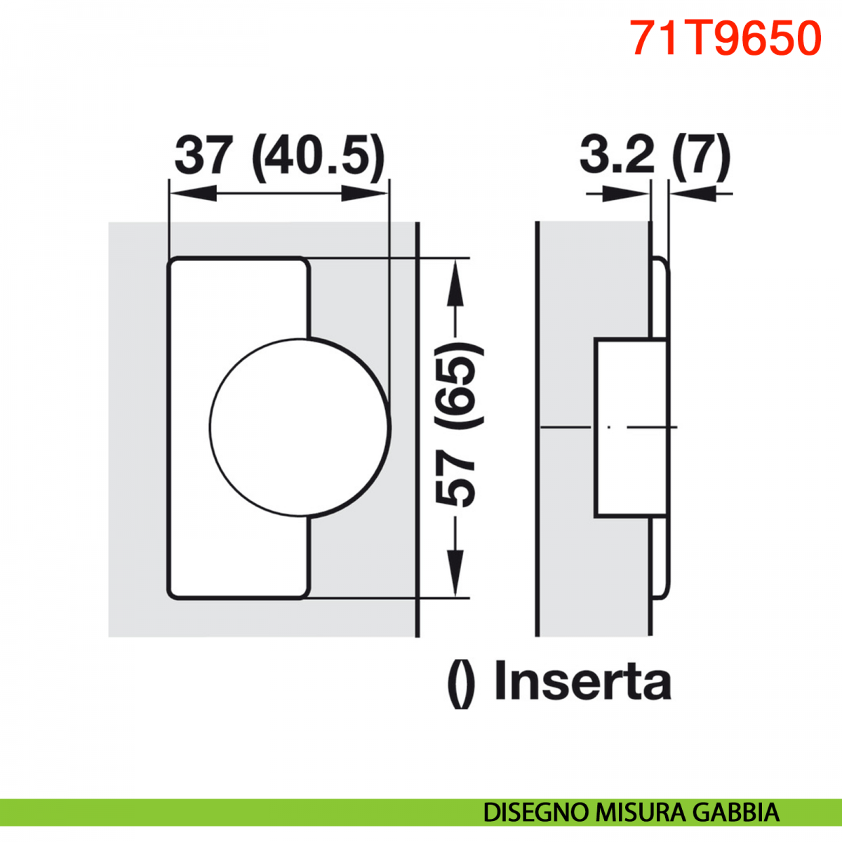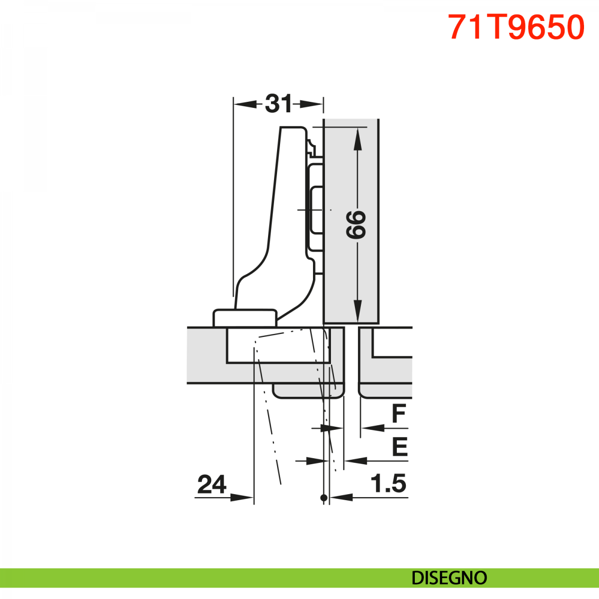 Cerniera Blum 71T9650 serie Clip Top per ante spesse o per ante con profilati, per ante a mezza battuta, con molla (chiusura con autoscatto), angolo di apertura 95°, con fissaggio a viti.