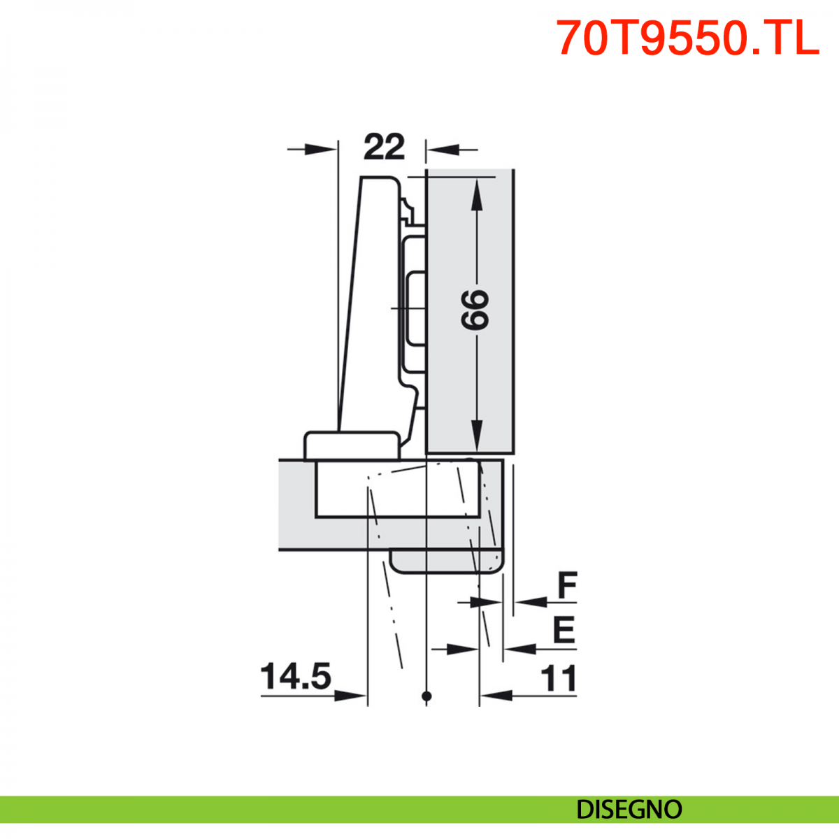 Cerniera Blum 70T9550.TL serie Clip Top per ante spesse o per ante con profilati, per ante a battuta, senza molla (chiusura libera), angolo di apertura 95°, con fissaggio a viti.
