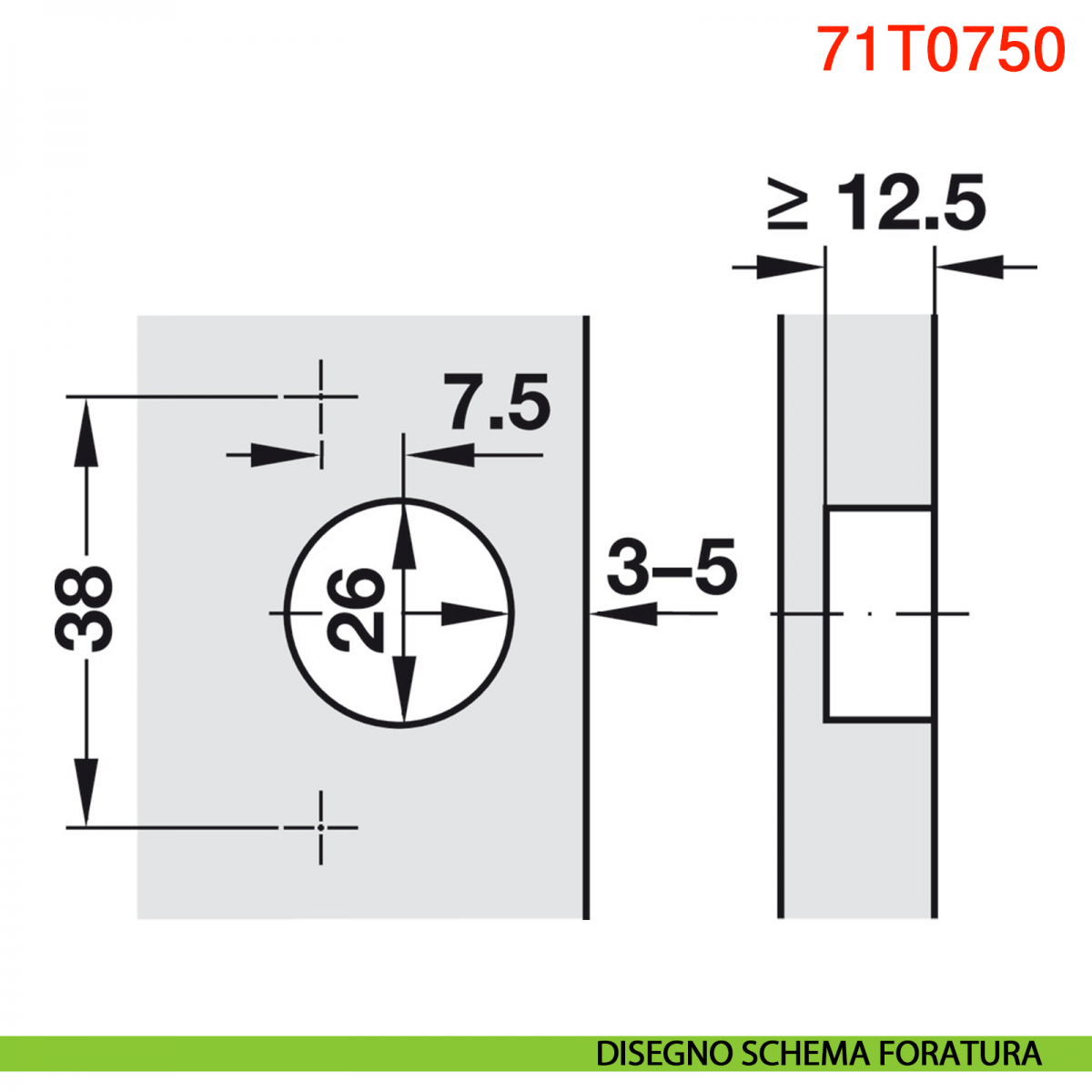 Cerniera Blum 71T0750 serie Clip Top Mini per ante con telai stretti, per ante battuta interna, con molla (chiusura con autoscatto), angolo di apertura 94°, con fissaggio a viti.