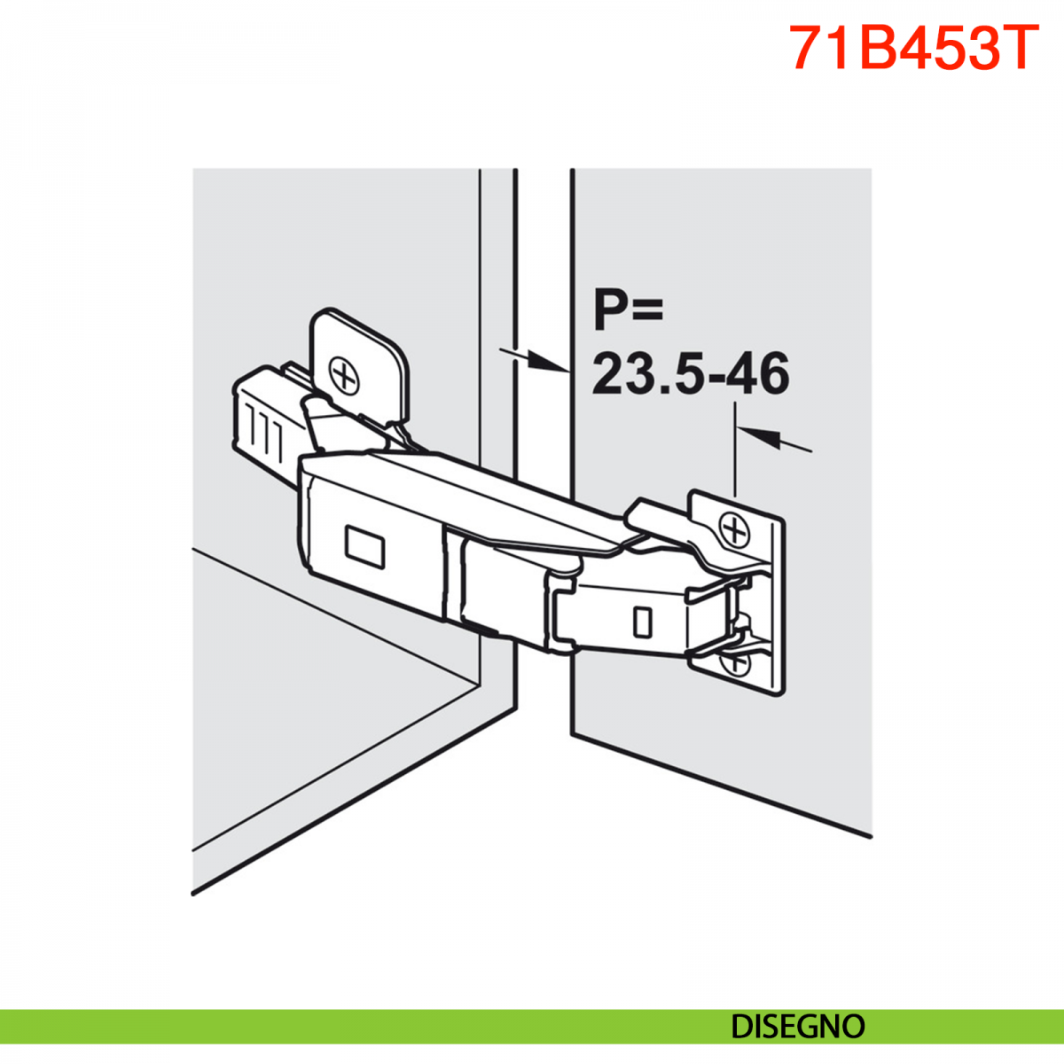 Cerniera Blum 71B453T serie Clip Top Blumotion, per anta sottile spessore da 8 a 14 mm, con ammortizzatore Blumotion incorporato, angolo di apertura 110°, protusione 0, fissaggio EXPANDO T per i materiali più diversi.