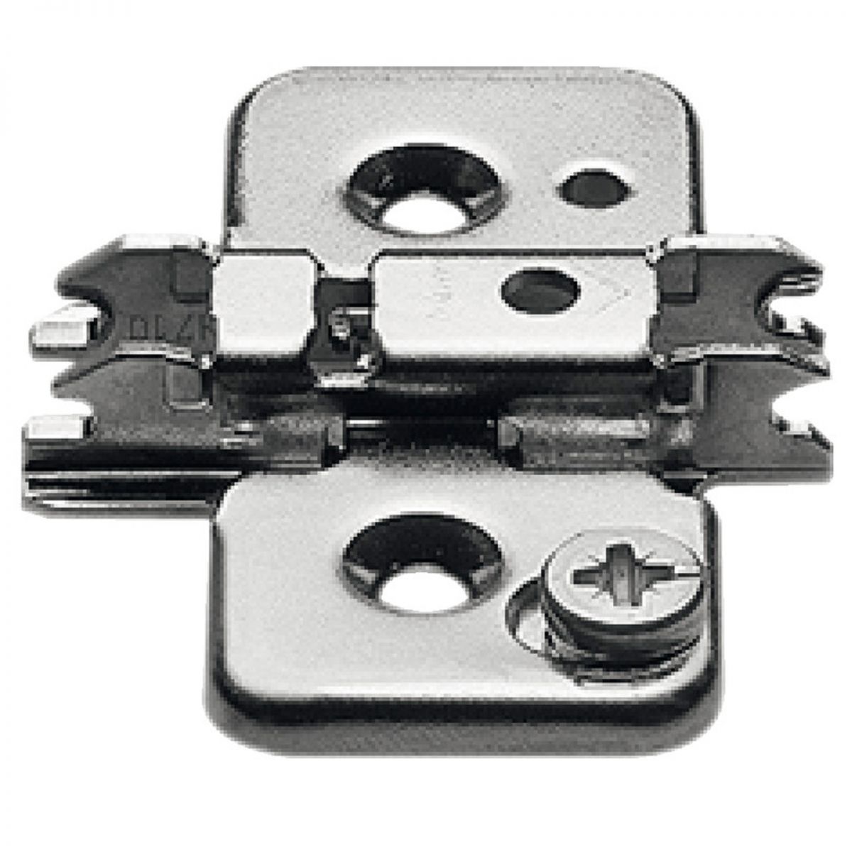 Basetta a croce Blum 173H7100 Clip spessore 0 mm (altezza 8,5 mm) , con eccentrico di regolazione, per cerniere Blum Clip Top Blumotion, Clip Top, Clip, applicazioni angolari con cuneo angolare, montaggio con viti per truciolare, nichelato.