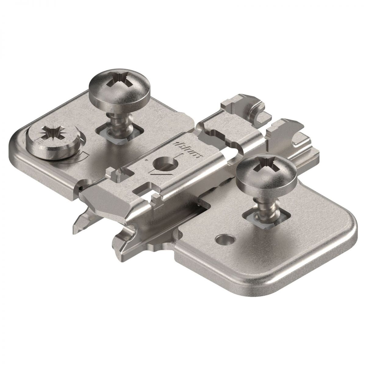 Basetta a croce Blum 174H7100E Clip spessore 0 mm (altezza 8,5 mm), con eccentrico di regolazione, per cerniere Blum Clip Top Blumotion, Clip Top, Clip, applicazioni angolari con cuneo angolare, montaggio con viti speciali premontate con bussole a espansione (EXPANDO), nichelato.