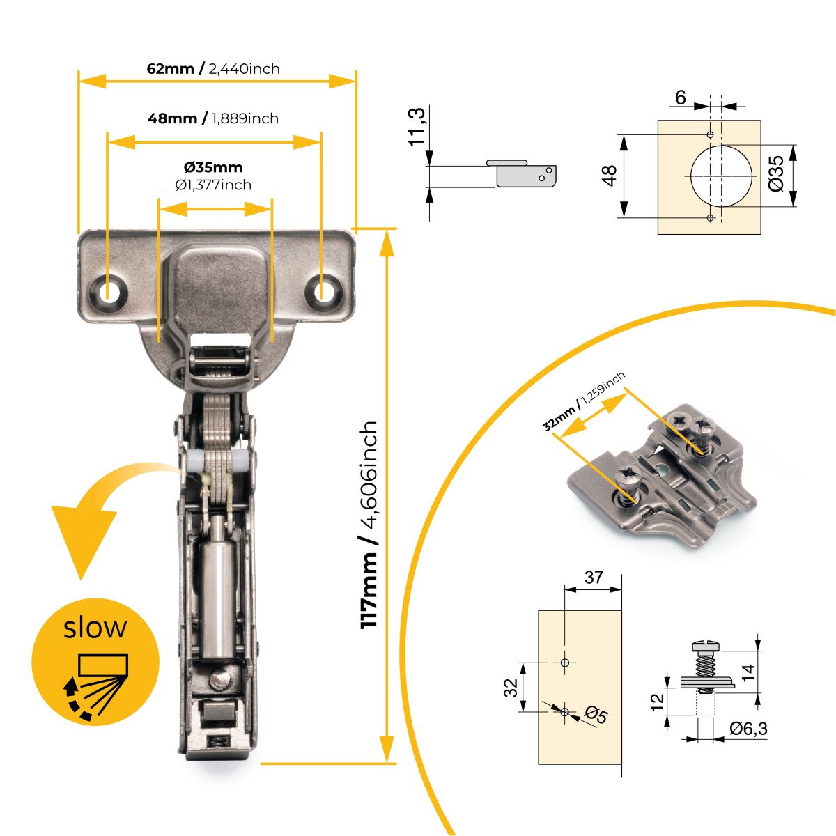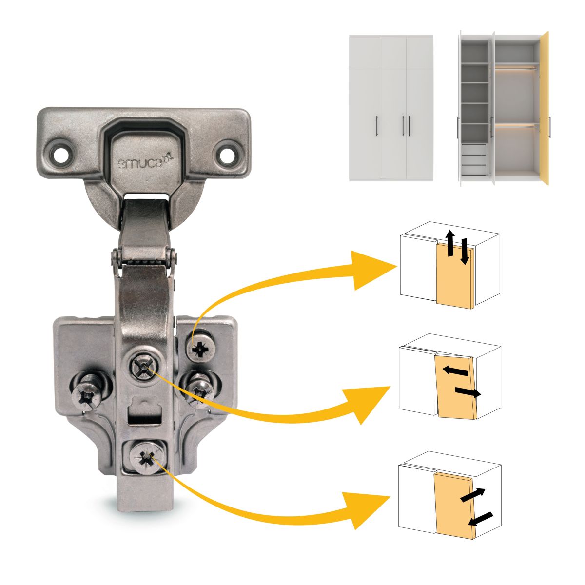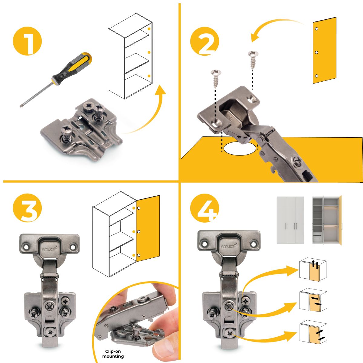 Cerniere per ante progettate per l'utilizzo nei mobili della casa e dell'ufficio con alta qualità e al miglior prezzo. Con pistone ammortizzatore che regola la chiusura soft dell'anta. Sono disponibili in collo dritto con apertura dell'anta a 105º. Per la sua istallazione è necessario un foro diametro 35 mm per lo scodellino. E il fissaggio al pannello avviene mediante le viti incluse. Allo stesso tempo è molto facile l'istallazione grazie al sistema automatico di montaggio a clip della cerniera alla basetta. Inoltre entrambi dispongono di vite eccentrica per una regolazione rapida e comoda. Il fissaggio della basetta avviene con vite Euro che necessita di un foro diamentro 5 x 12 mm nella spalla del mobile.