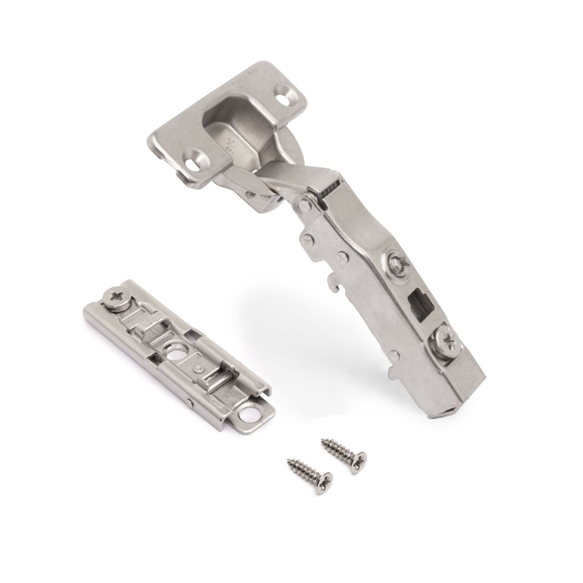 Basetta a vite altezza 1. Regolazione dell'altezza dell'anta con eccentrici ±1,5 mm. Grazie al suo design tecnico, le basette installate con la cerniera rimangono nascoste sotto il braccio della cerniera.