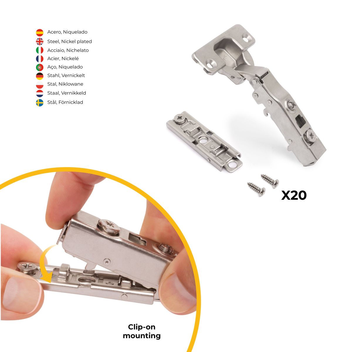 20 cerniere, 20 basetta diretti, viti di montaggio