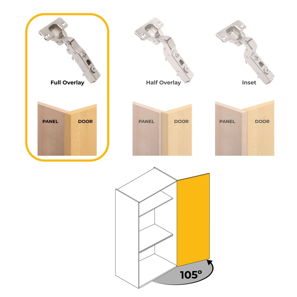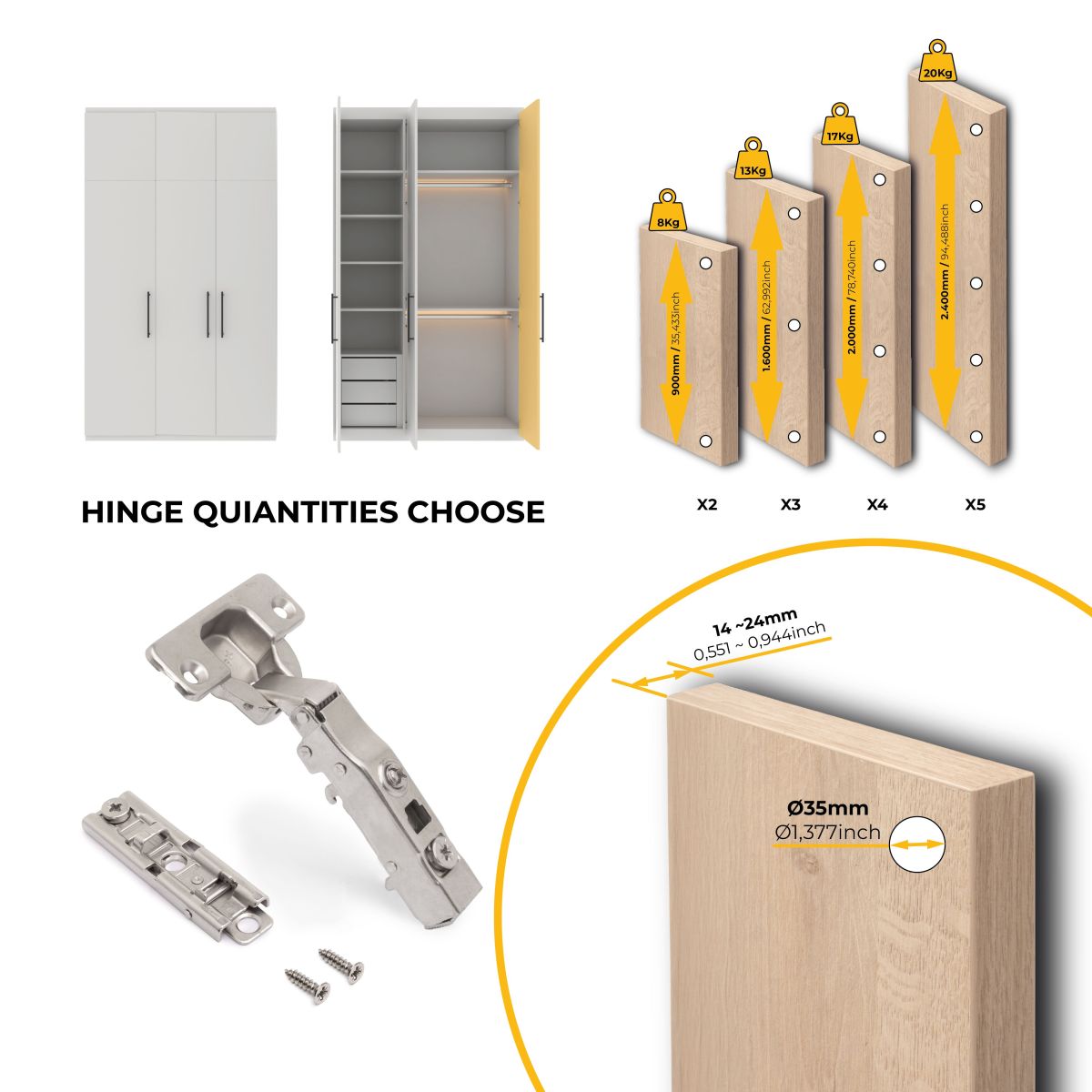 Scodellino con diametro di 35 mm, apertura105º e tolleranza di foratura dello scodellino D = 3 - 7 mm. Spessore dell'anta da 14 a 24 mm. Regolabile tridimensionalmente e regolazione in profondità eccentrica. Molla di apertura e chiusura e dispone di un pistone ammortizzatore per la chiusura soft dell'anta.