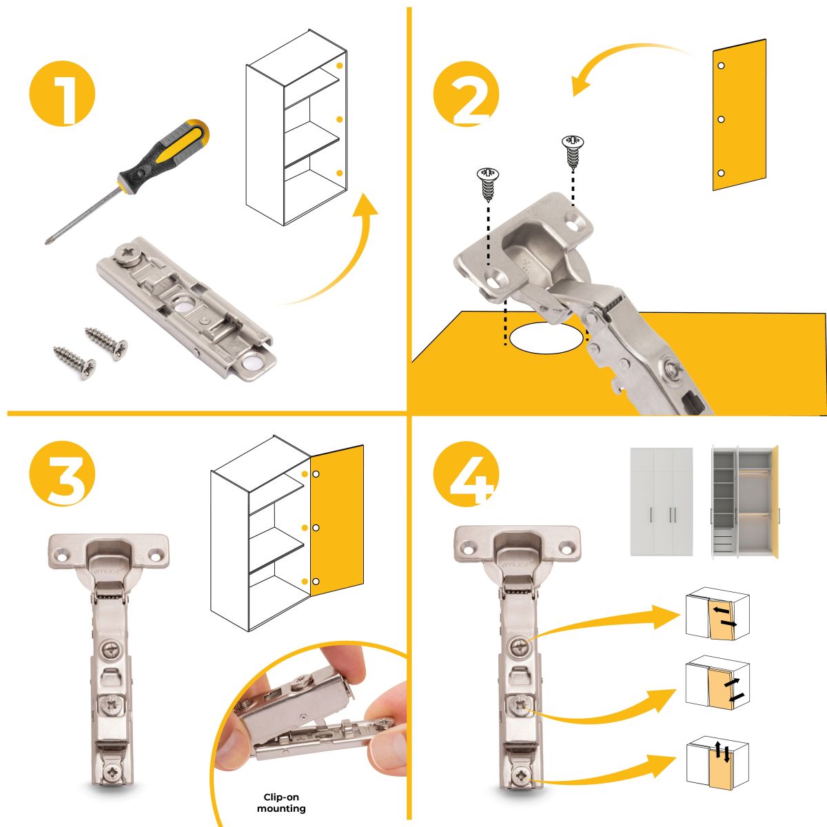 Sistema automatico di montaggio a clip della cerniera alla basetta. Per l'installazione si consiglia di utilizzare le viti in dotazione.