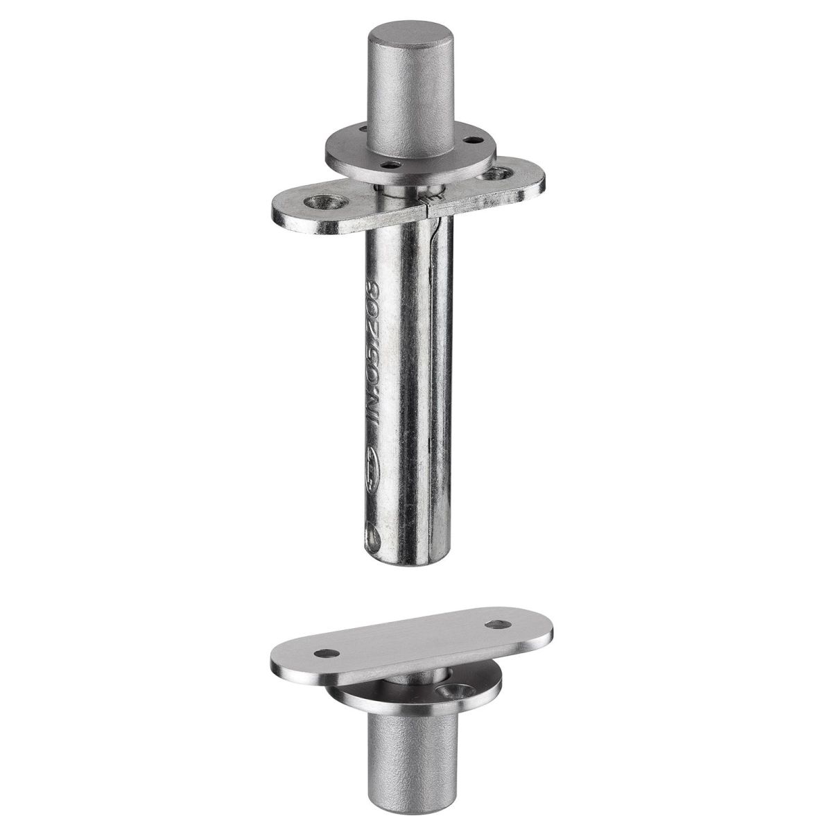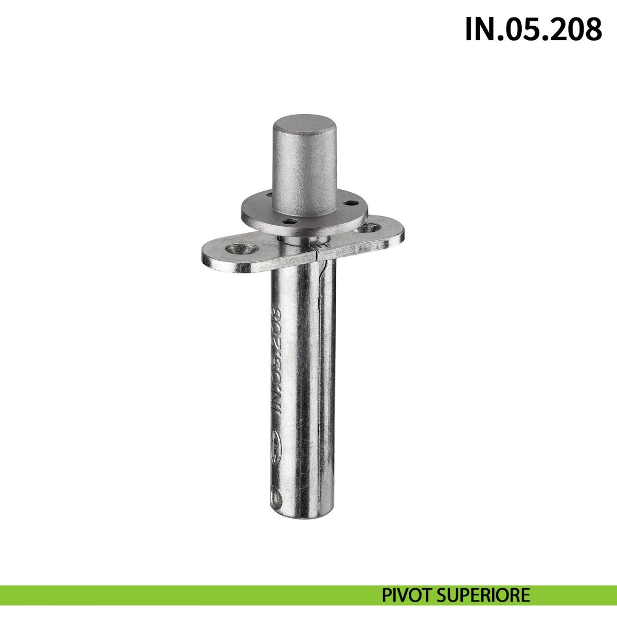 Cerniera a perno pivot a scomparsa JNF IN.05.208 con rotazione libera a 360° e portata 65 kg, ideale per porte a bilico in legno, spessore minimo della porta 35 mm fino ad un massimo di 50 mm in finitura acciaio satinato.
