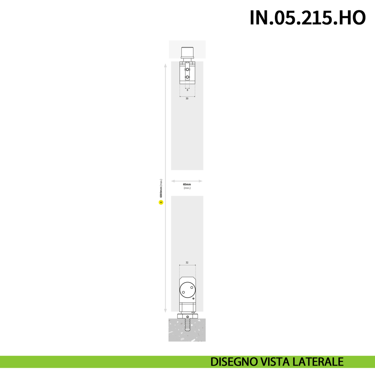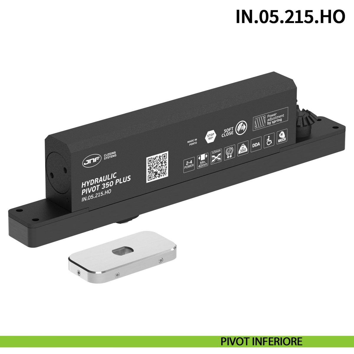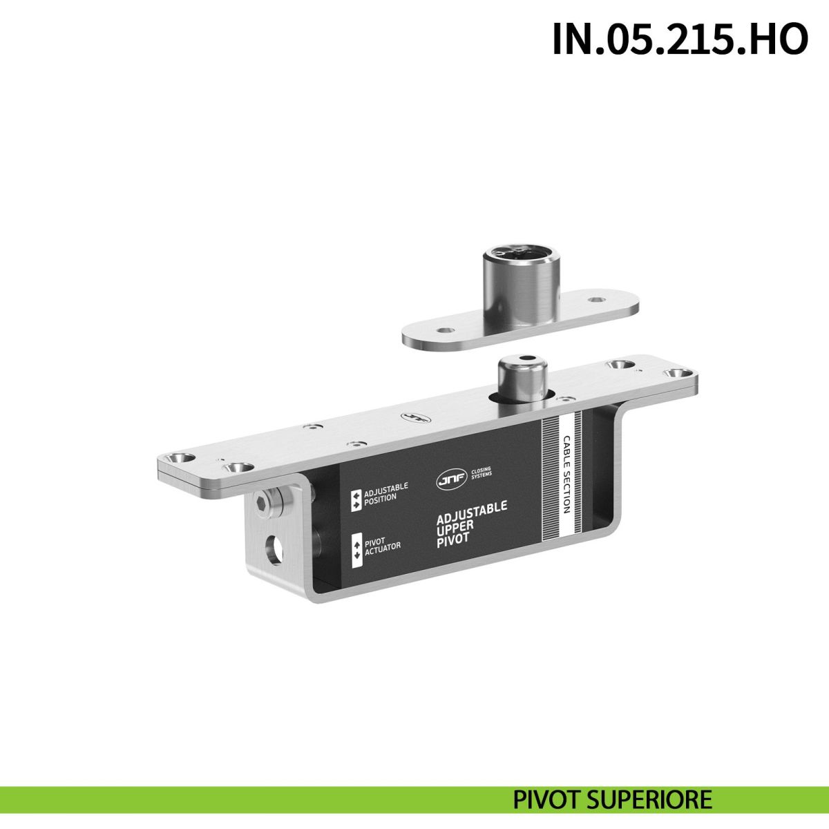 Cerniera pivot idraulica a pavimento JNF IN.05.215.HO modello 350 PLUS con chiusura automatica e portata 350 kg, ideale per porte a bilico di grandi dimensioni in legno, alluminio o metallo con larghezza massima 3000 mm e altezza massima 6000 mm, spessore minimo della porta 40 mm e velocità di chiusura regolabile, funzione passa cavi, in finitura satinata.