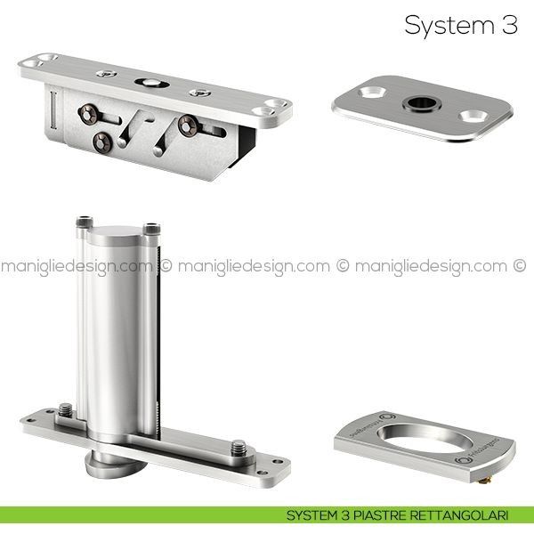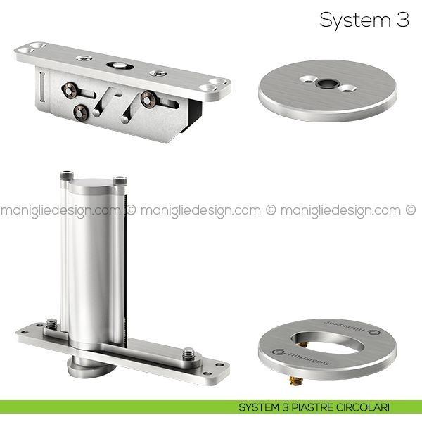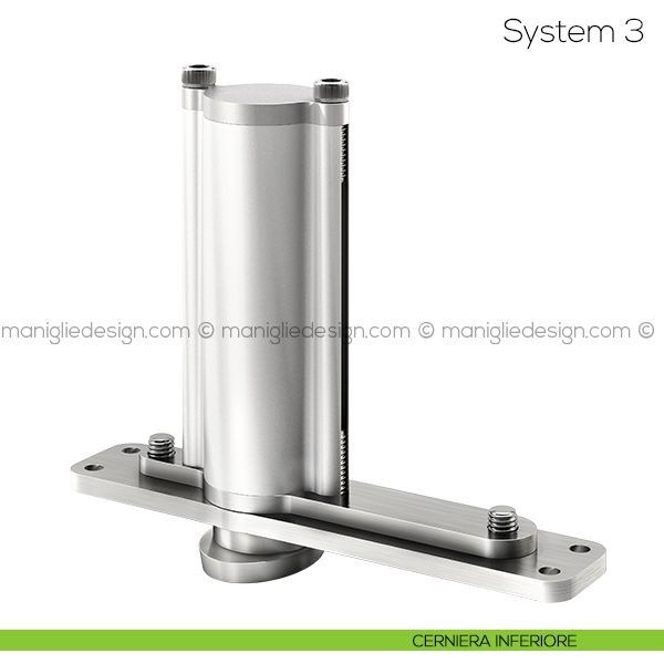 System 3 ha tre funzioni: rotazione, chiusura e posizione di fermo ogni 90°. La cerniera consente dunque alla porta di compiere una rotazione completa e di fermarsi ad ogni quarto di cerchio. FritsJurgens System 3 è il sistema per bilico che permette di realizzare porte senza elementi strutturali da installare a pavimento o a soffitto. La portata massima del sistema fino a 500 kg permette di muovere porte esterne o interne di grandi dimensioni, lo spessore minimo necessario per ogni porta è di 40 mm. Il montaggio di System 3 è semplice, rapido e non necessita di alcuna manutenzione nel tempo. Può essere applicato su porte già esistenti, ed è particolarmente indicato in applicazioni in ambito contract e residenziale.