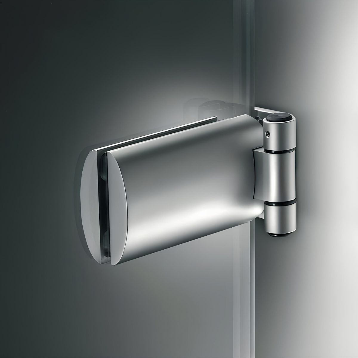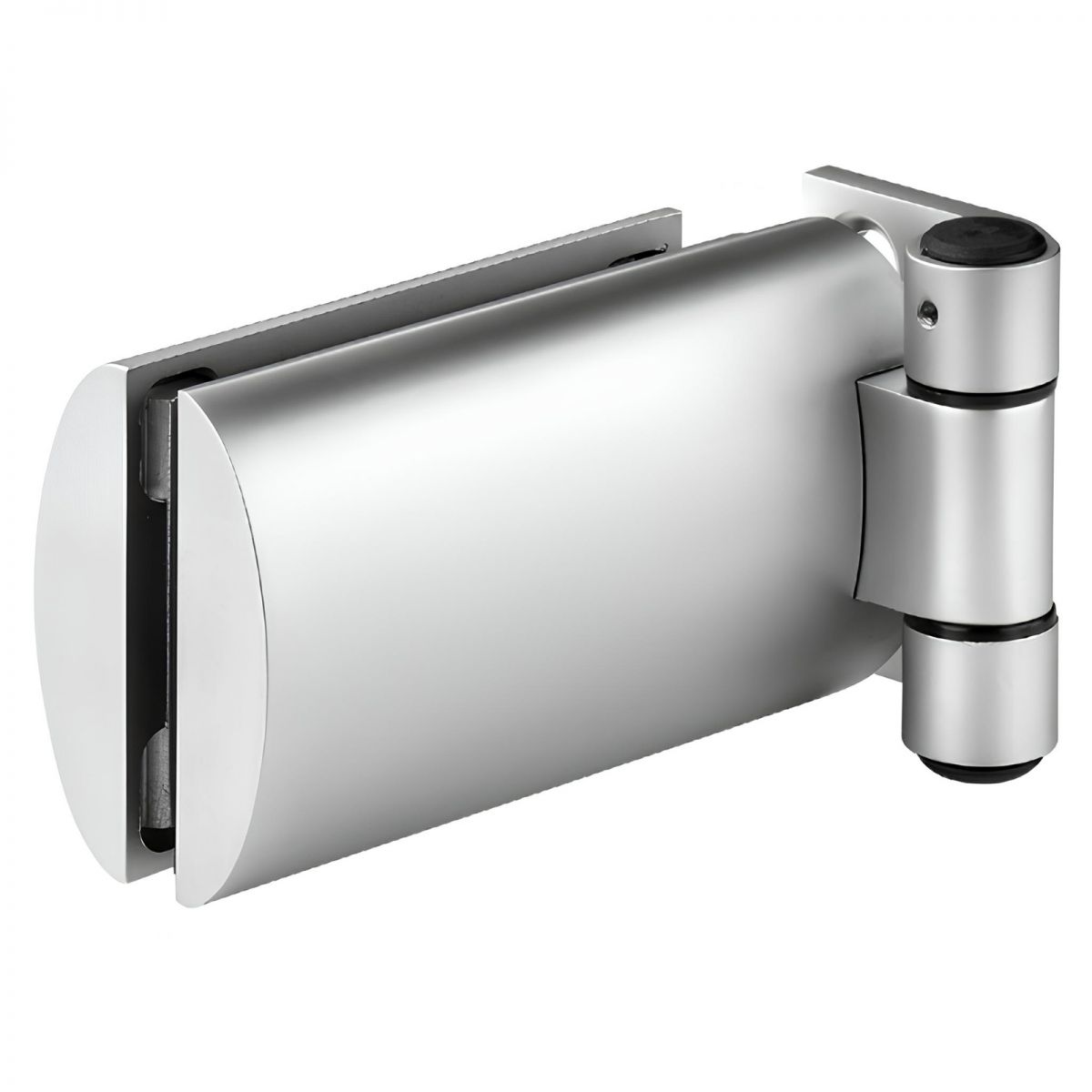 Cerniera per porta in vetro a battente Meroni Gliss braccio normale, portata massima 50 kg (2 cerniere), spessore vetro 8-12 mm, rotazione 180°, materiale alluminio, finitura cromo opaco.