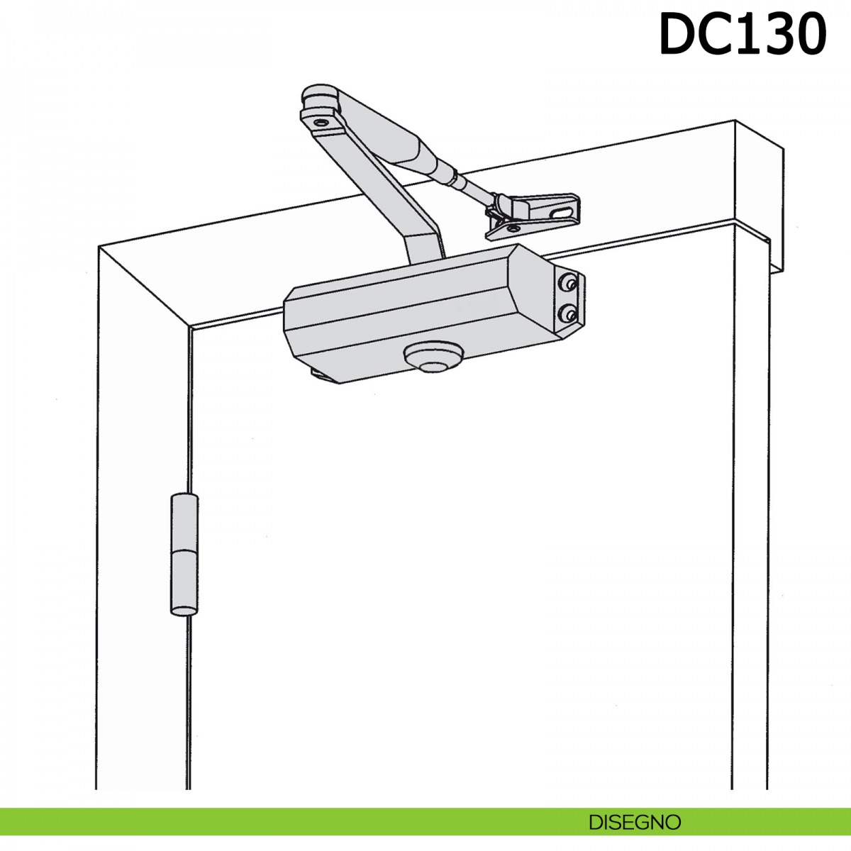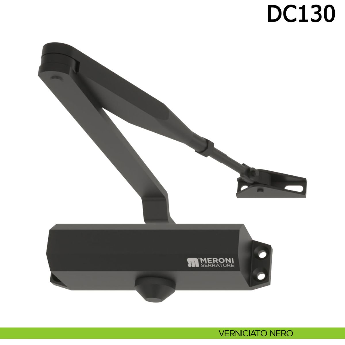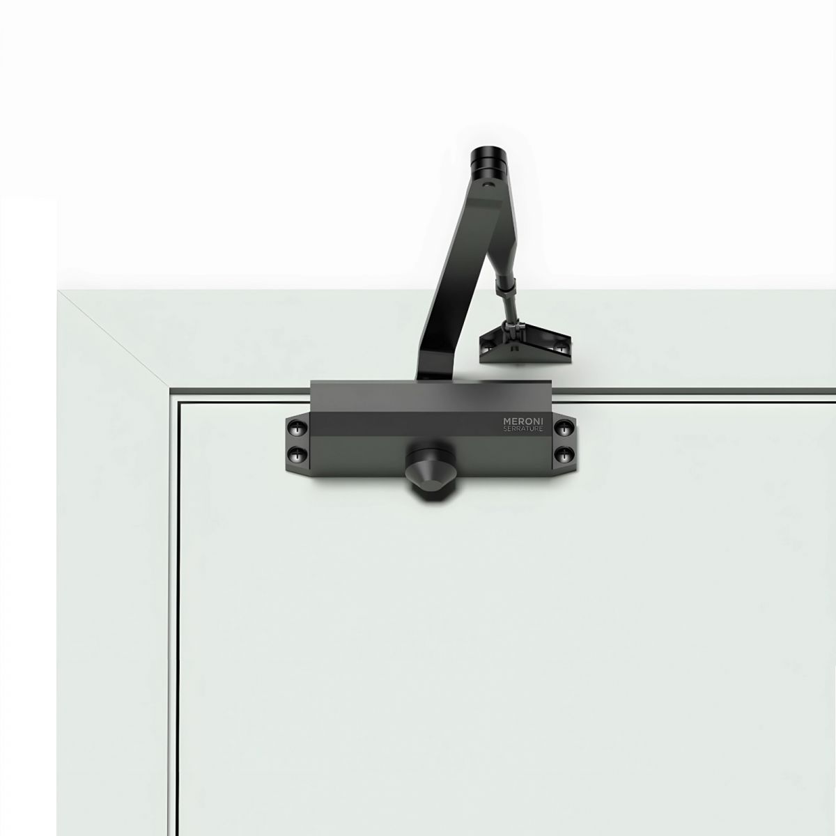 Chiudiporta aereo Meroni DC130 a forza variabile EN 3-4 braccio standard (esercita la sola funzione di chiusura della porta), installabili su porte con apertura destra o sinistra, conformi alla norma EN 1154.