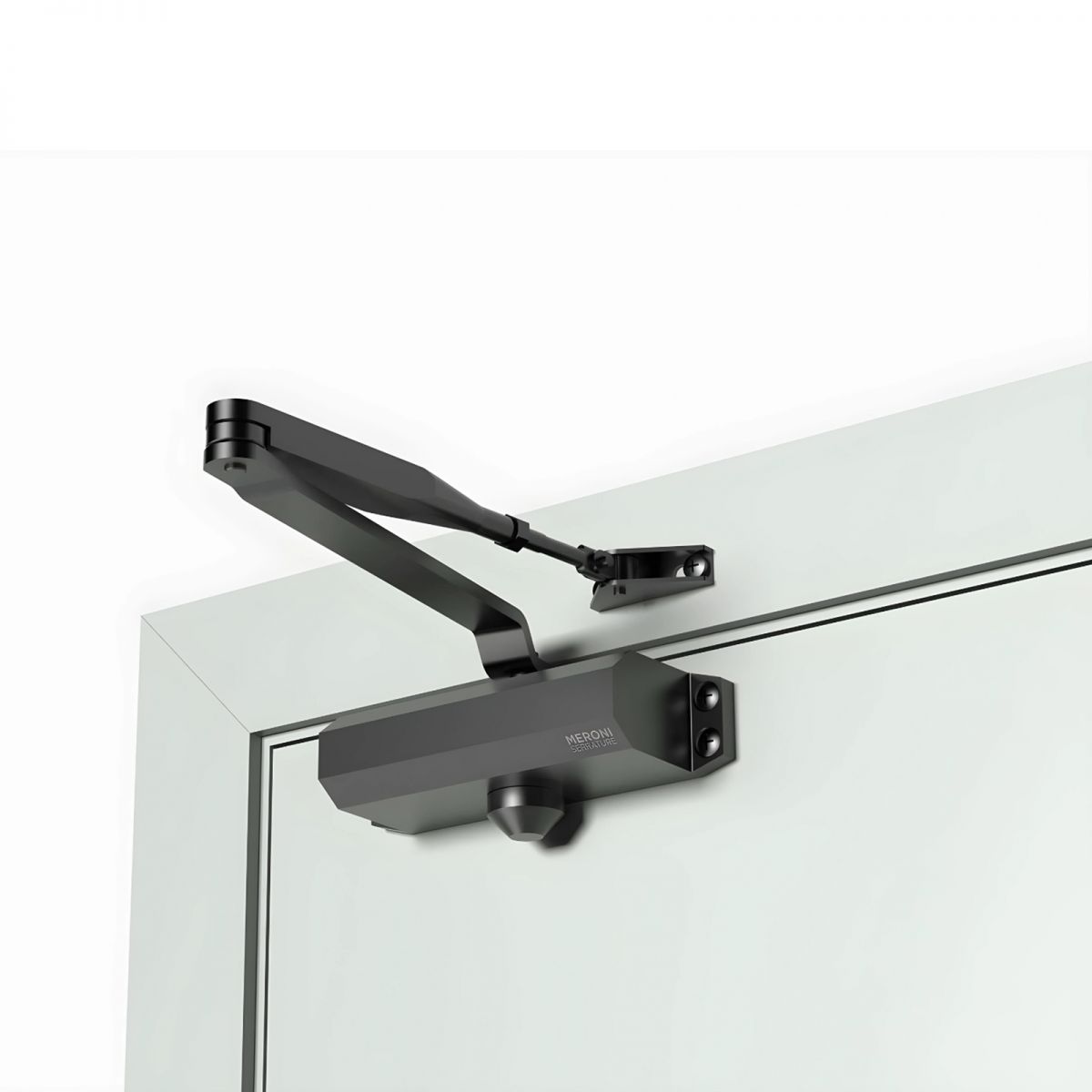 Chiudiporta aereo Meroni DC130 a forza variabile EN 3-4 braccio con fermo (oltre alla chiusura della porta, consente il bloccaggio a 90°), installabili su porte con apertura destra o sinistra, conformi alla norma EN 1154.