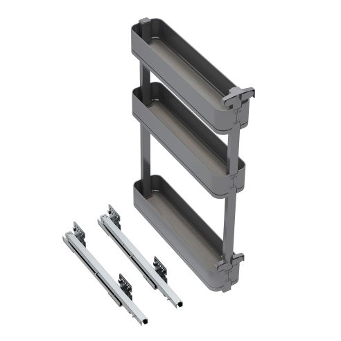 Portabottiglie laterale estraibile con 3 cesti, progettato per massimizzare lo spazio e l’organizzazione all’interno dei mobili da cucina – una soluzione funzionale ed esteticamente curata.