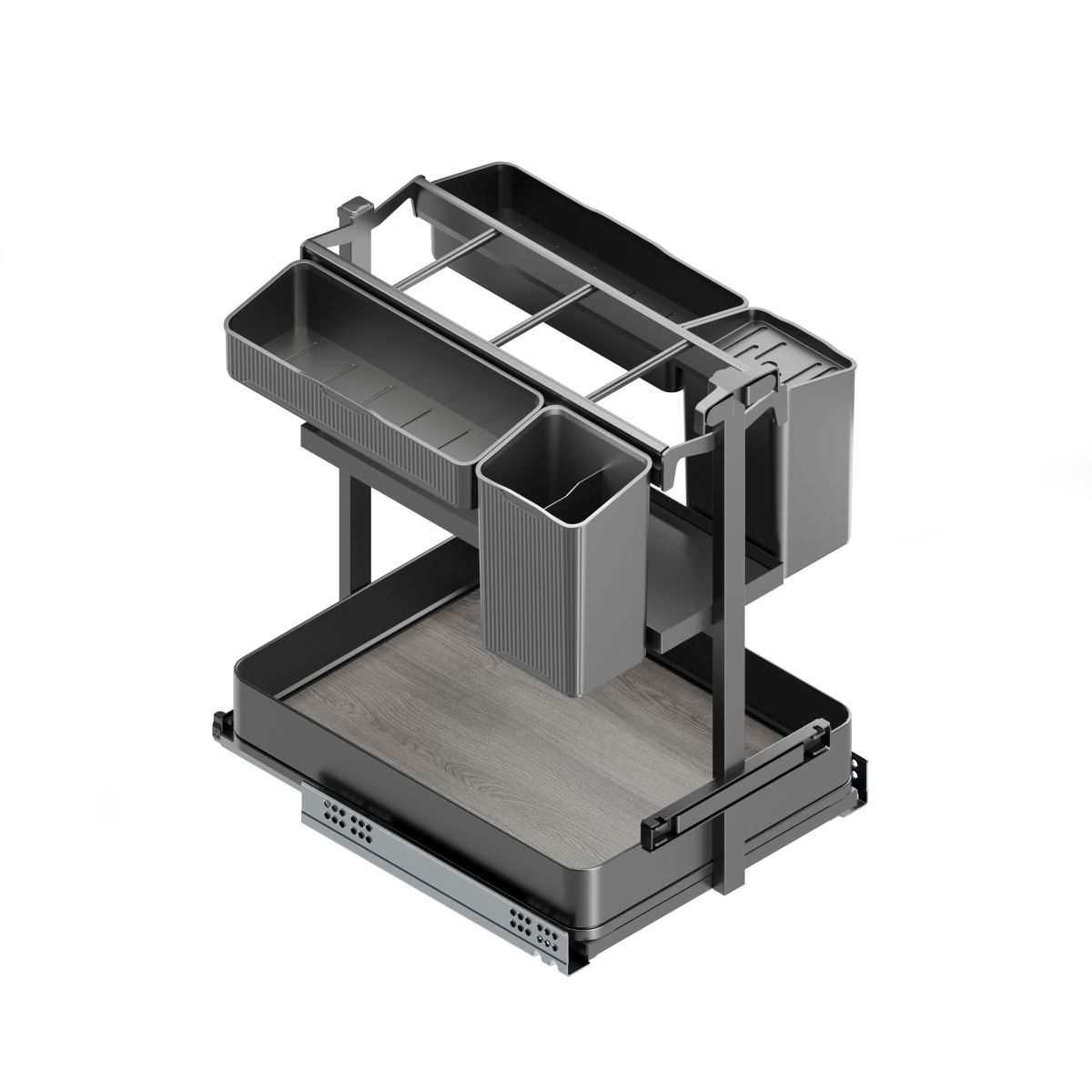 Carrello estraibile con cestelli e accessori, progettato per massimizzare lo spazio di stoccaggio e sfruttare al meglio lo spazio disponibile nei mobili da cucina – una soluzione funzionale ed esteticamente gradevole.