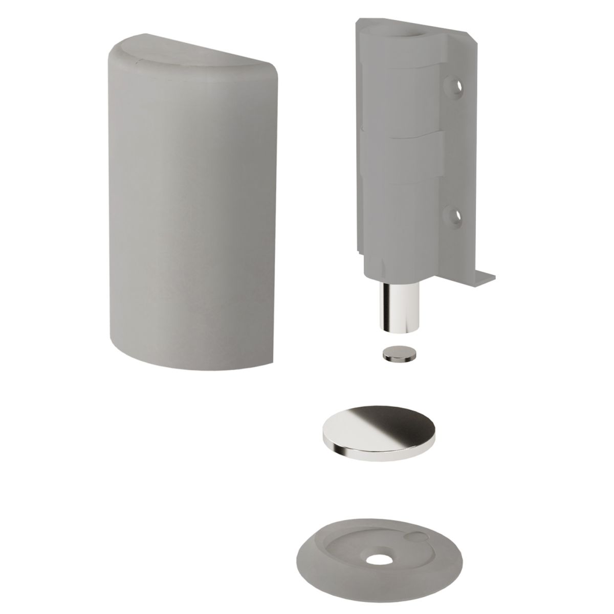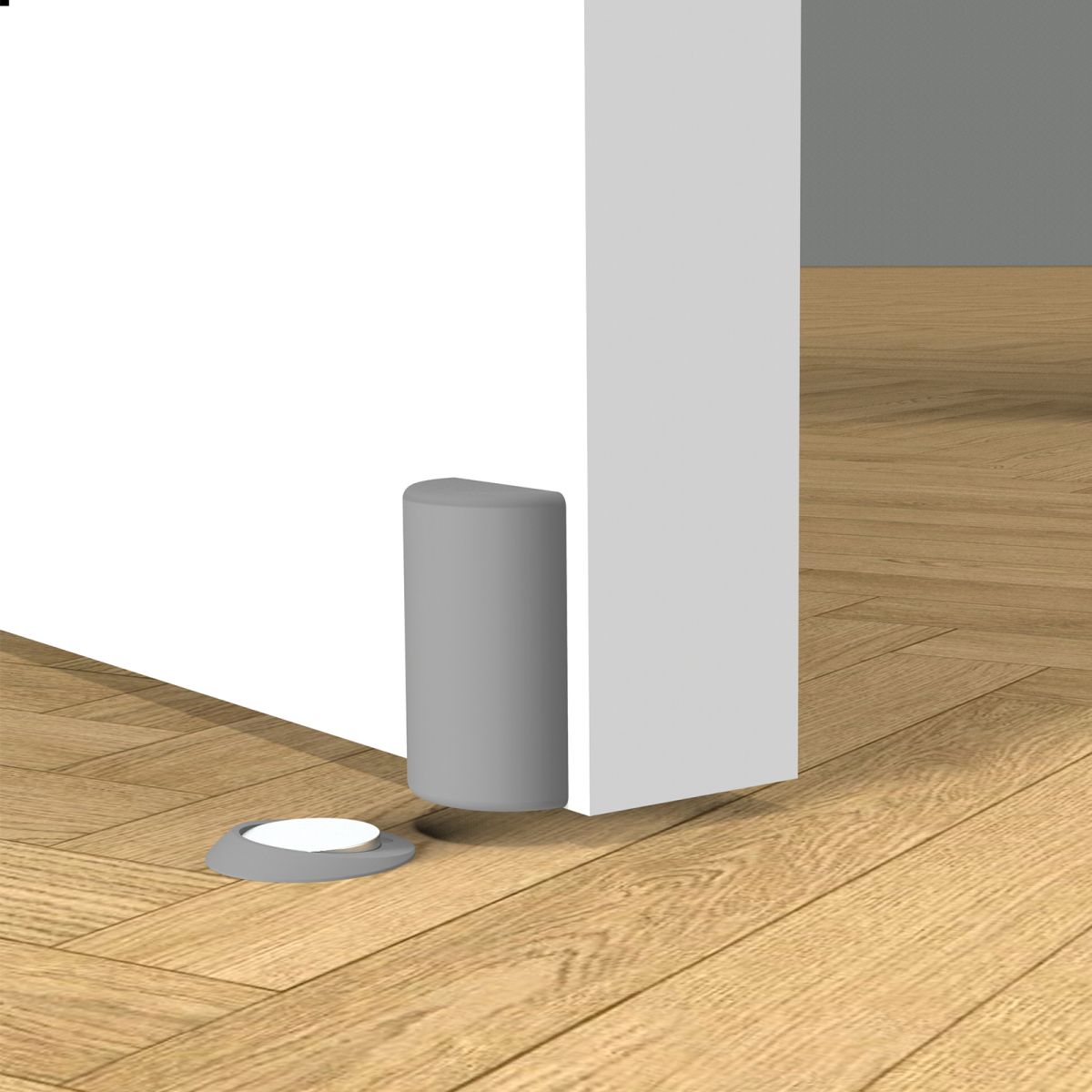 Fermaporta magnetico esterno Stoppino X Verum Italy, da applicare direttamente sul pannello porta tramite biadesivo o con viti nascoste, comprensivo di base campestabile applicabile a pavimento tramite biadesivo o con vite.