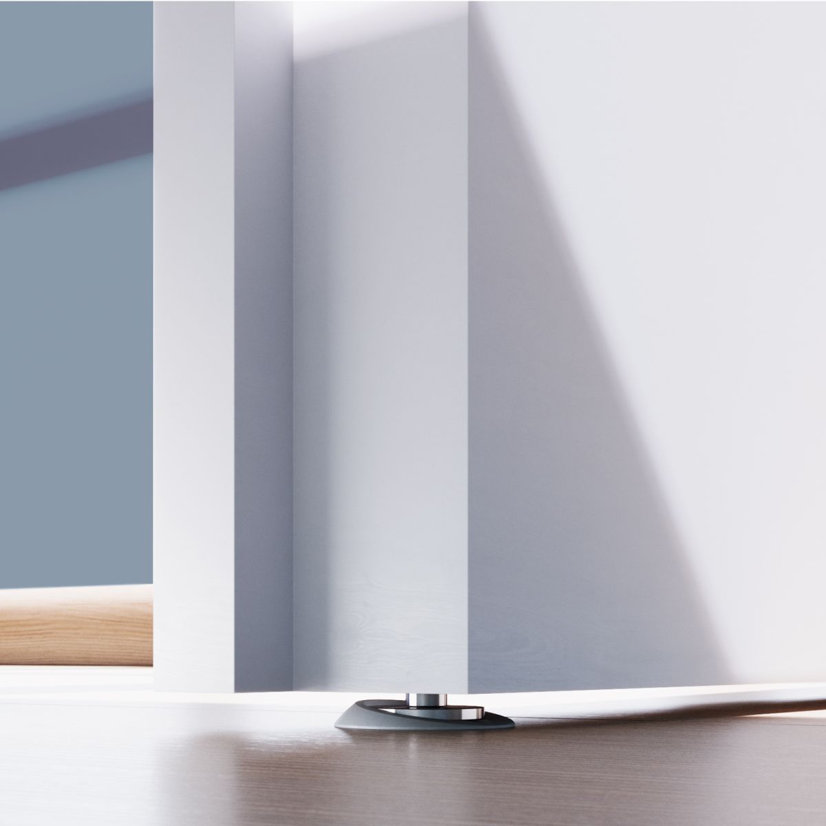 Fermaporta magnetico esterno Stoppino X Verum Italy, da applicare direttamente sul pannello porta tramite biadesivo o con viti nascoste, comprensivo di base campestabile applicabile a pavimento tramite biadesivo o con vite.