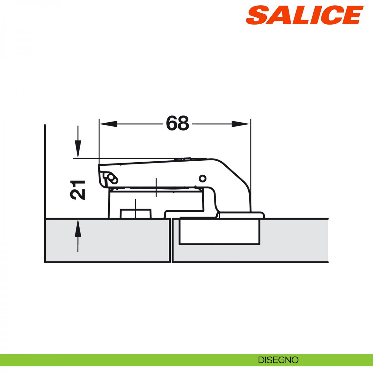 Cerniera Salice C7A6NE9 Serie Silentia+ controcollo per piccoli spazi, per ante in legno con apertura 110 gradi, diametro foratura 35 mm, con ammortizzatore regolabile integrato nella gabbia della cerniera.