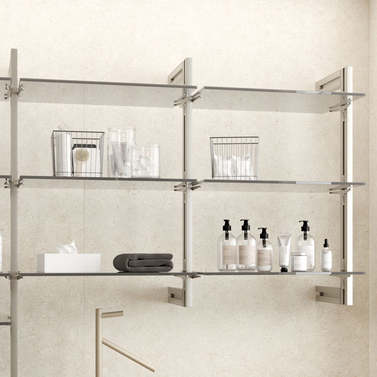 Il suo design si adatta a tutti i tipi di ambienti e stanze: casa, camerini, uffici e negozi. Combinate gli accessori con i profili per creare la vostra composizione ideale: ripiani in legno o vetro, moduli o piccoli armadi e appendini.