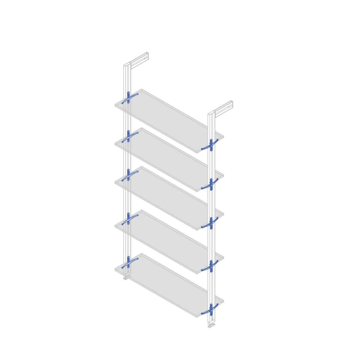 Set di 5 staffe per mensole in vetro ad alta resistenza. Il kit comprende 5 set per assemblare 5 ripiani, tutti gli accessori necessari e le istruzioni per il montaggio. I ripiani e il profilo non sono inclusi, è possibile acquistare il profilo ricercando il codice 70236 49 (8432393300429) o 70237 49 (8432393300436).