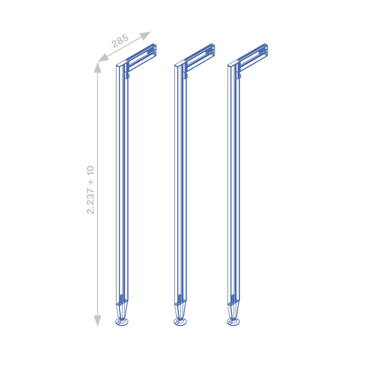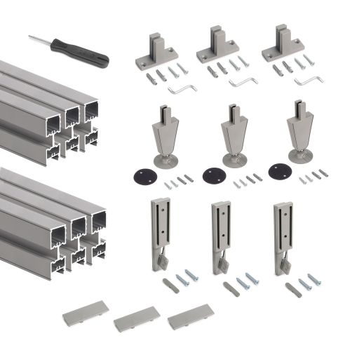 - Il kit è composto da 3 profili di lunghezza 2115 mm, 3 profili di lunghezza 210 mm, 3 fissaggi a parete, 3 connettori per profili, 3 livellatori, 3 copriprofili e le viti di montaggio.