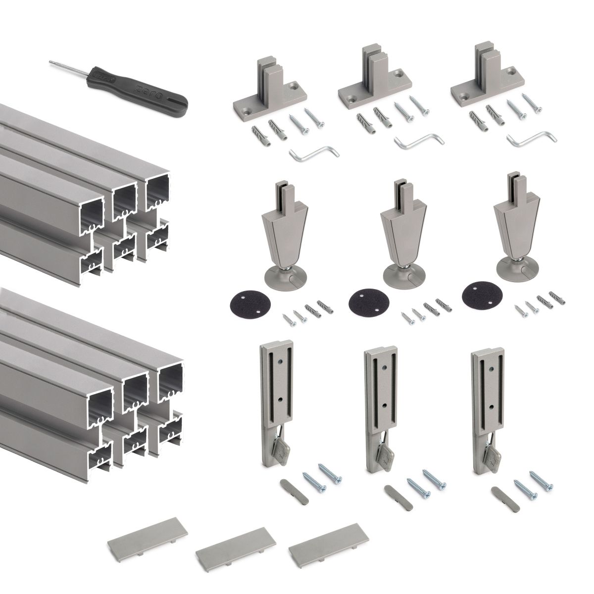 3 profili da 2.115 mm, 3 profili da 210 mm, 3 piedini, 3 connettori per profili, 3 fissaggi a parete, 12 viti Ø4x30, 12 tasselli Ø6x30, 6 viti Ø3,5x25, 3 tappi copriprofilo, 6 tappi accessori, 1 chiave a brugola