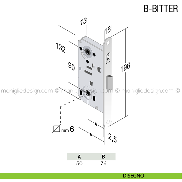 Serratura meccanica Bonaiti B-Bitter con nottolino WC modello T61 interasse 90 mm quadro 8-6 mm frontale 18x196 mm.