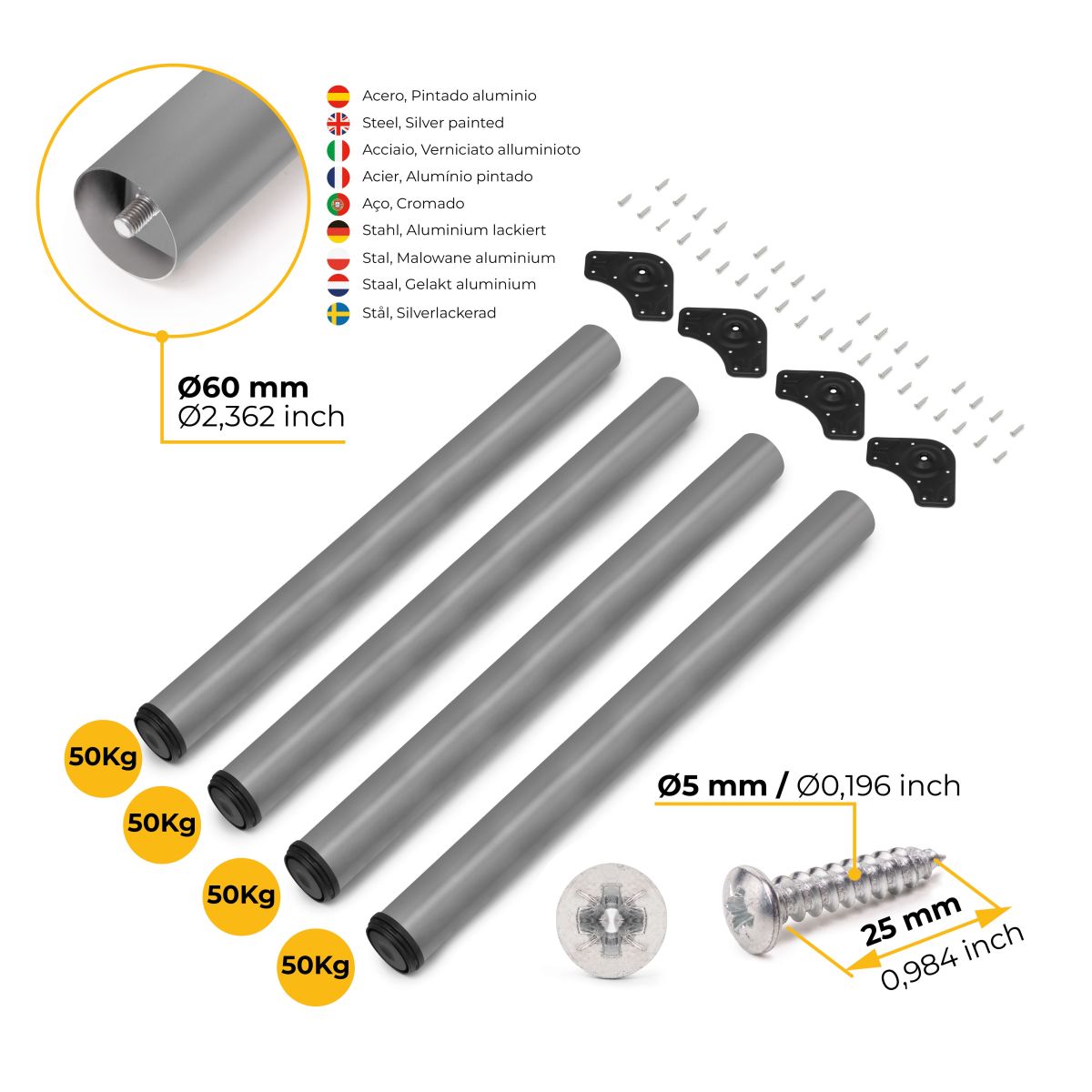 4 gambe per tavolo, 4 basi di fissaggio, viti di montaggio