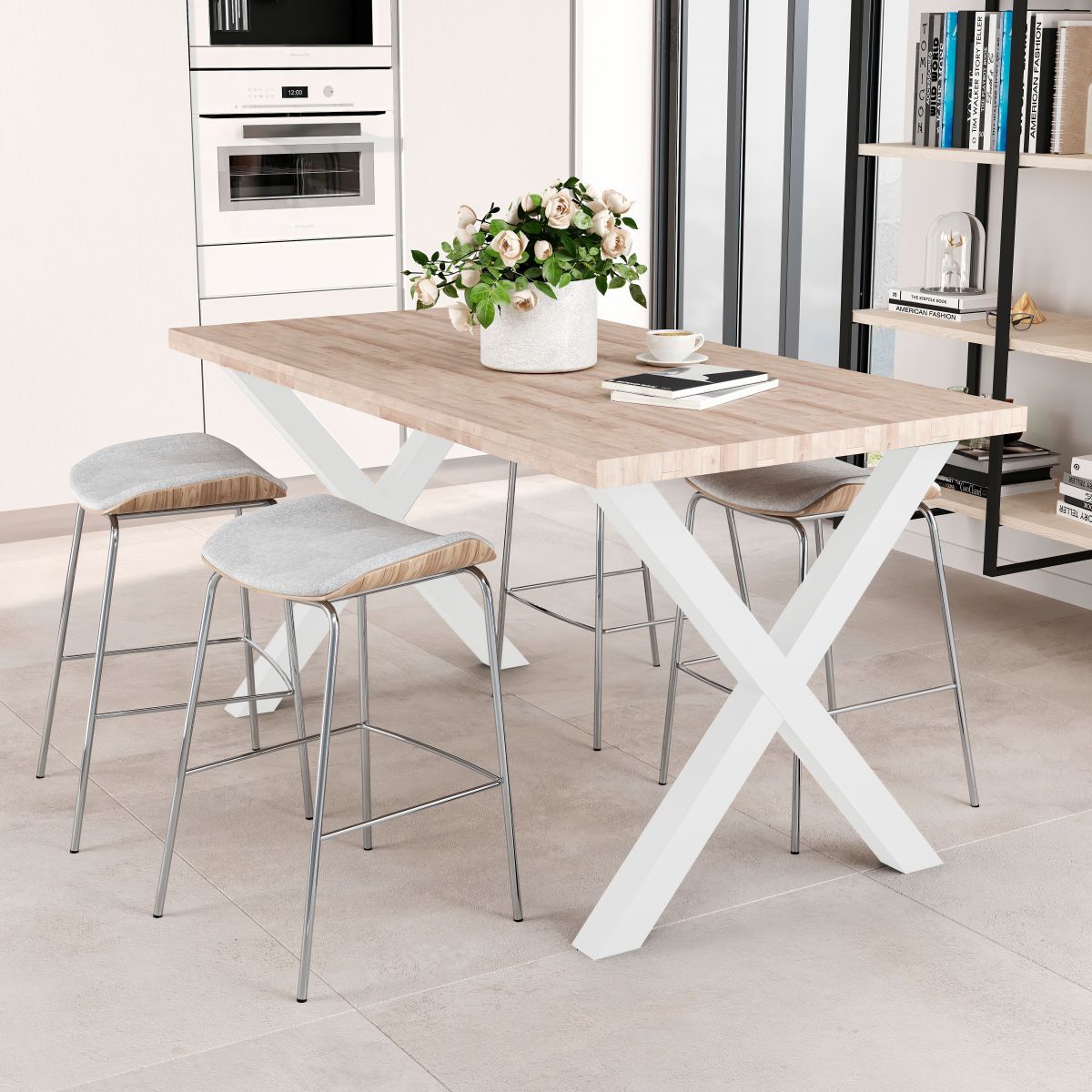 Set di 2 gambe da tavolo a forma di croce, ideali per tavoli da cucina e per la sala pranzo. La gamba fissa è alta 695 mm e larga 695 mm. Il montaggio è molto semplice, basta avvitare la gamba al piano del tavolo tramite le viti comprese nella fornitura. Include anche dei fermi per evitare segni sul pavimento. Le gambe sono in acciaio, verniciate nere o bianche .