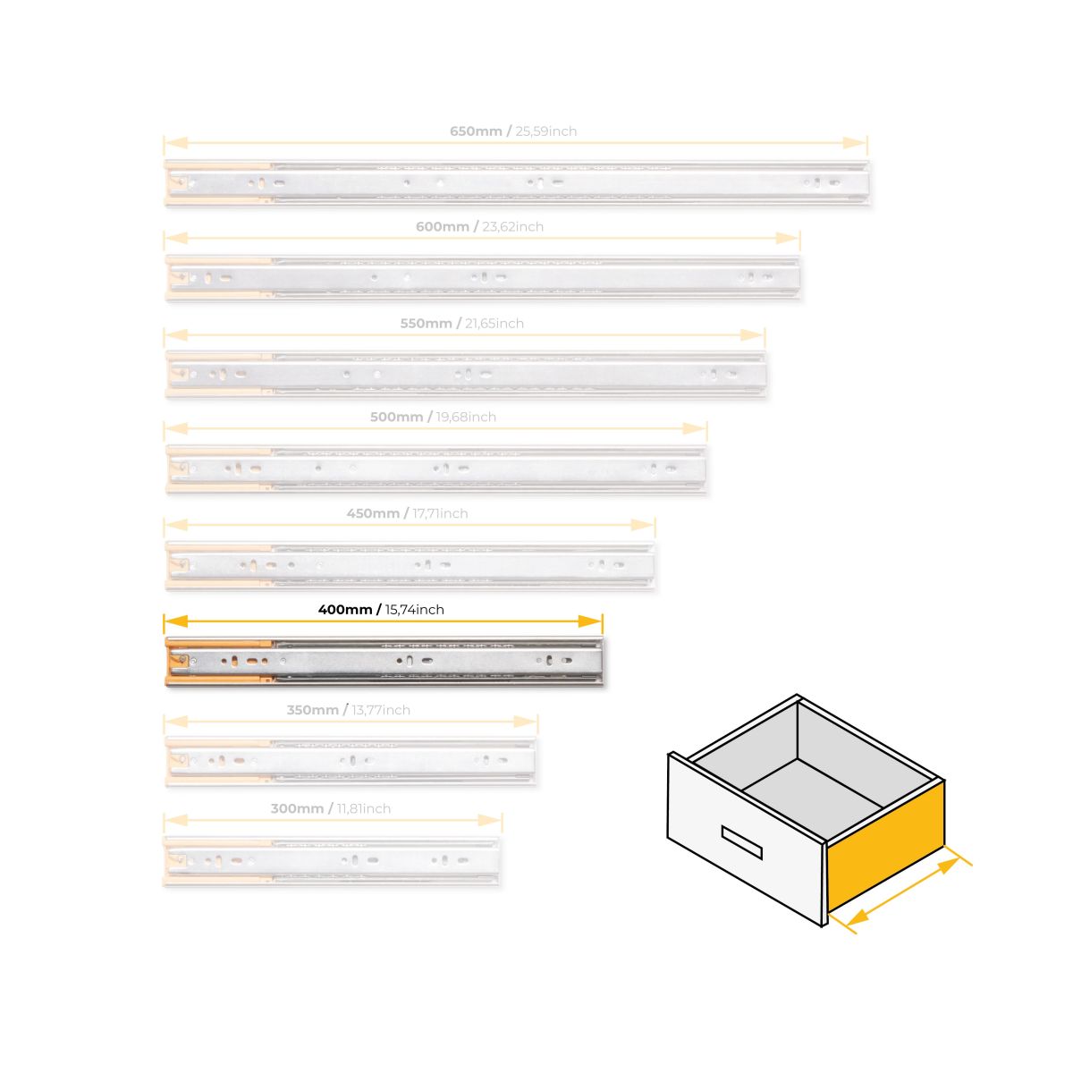 Guide con estrazione totale per cassetti con chiusura soft che fornisce una chiusura ammortizzata del cassetto, e uno scivolamento morbido e silenzioso grazie ai suoi cuscinetti a sfera di alta qualità. Sono noti, inoltre, per la grande capacità di carico che può arrivare a sopportare fino a 35 kg per cassetto. Il montaggio al cassetto si realizza mediante viti e lo smontaggio con grilletto.