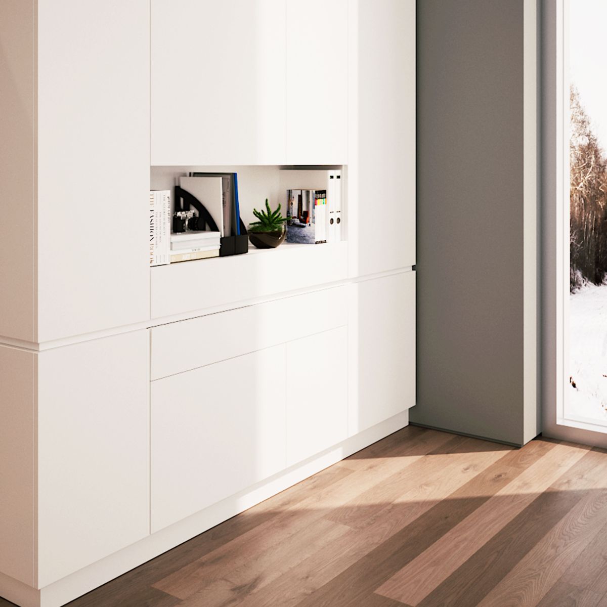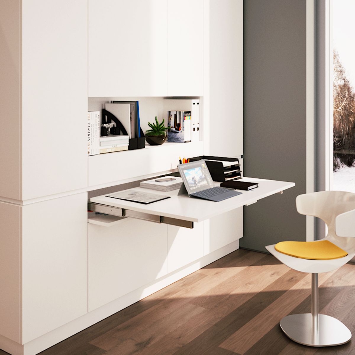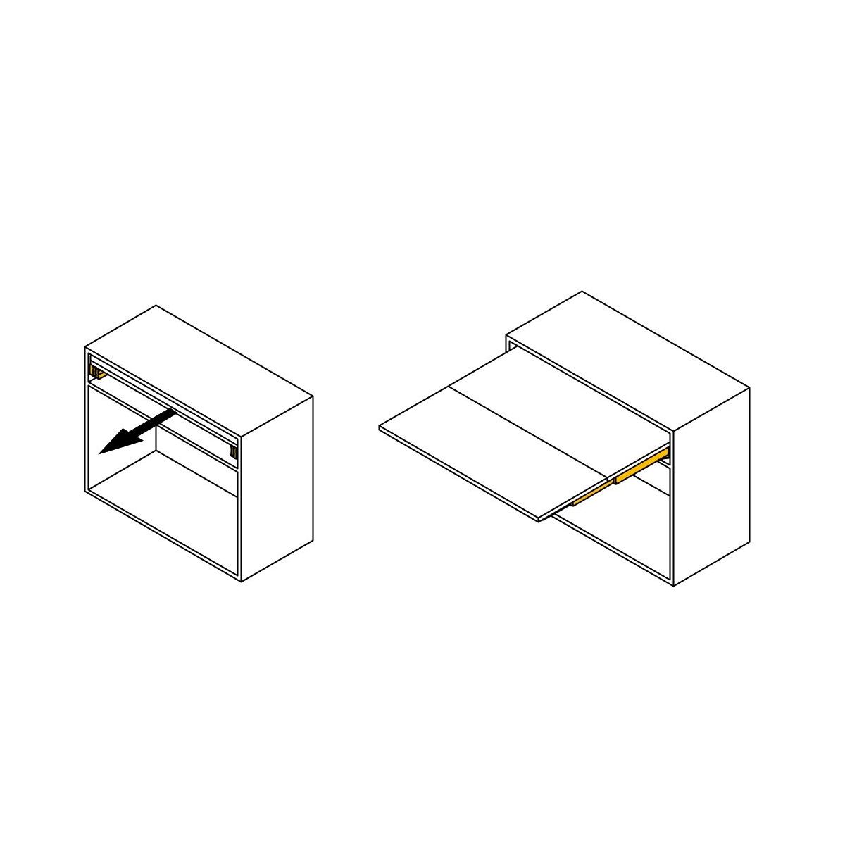 Il sistema può essere installato in moduli con una larghezza da 450 a 1.200 mm e una profondità minima di 390 mm. Le guide del sistema consentono l'estrazione di una superficie di 705 mm e un portata 60 Kg. Il tavolo è ottenuto per mezzo di 2 pannelli che si aprono con l'ausilio di cerniere, rimanendo alloggiati nello stesso vano del sistema una volta terminato il suo utilizzo. Inoltre, hanno un meccanismo di blocco di sicurezza per evitare che il tavolo si chiuda accidentalmente. Le tavole che compongono il piano di appoggio non sono comprese.