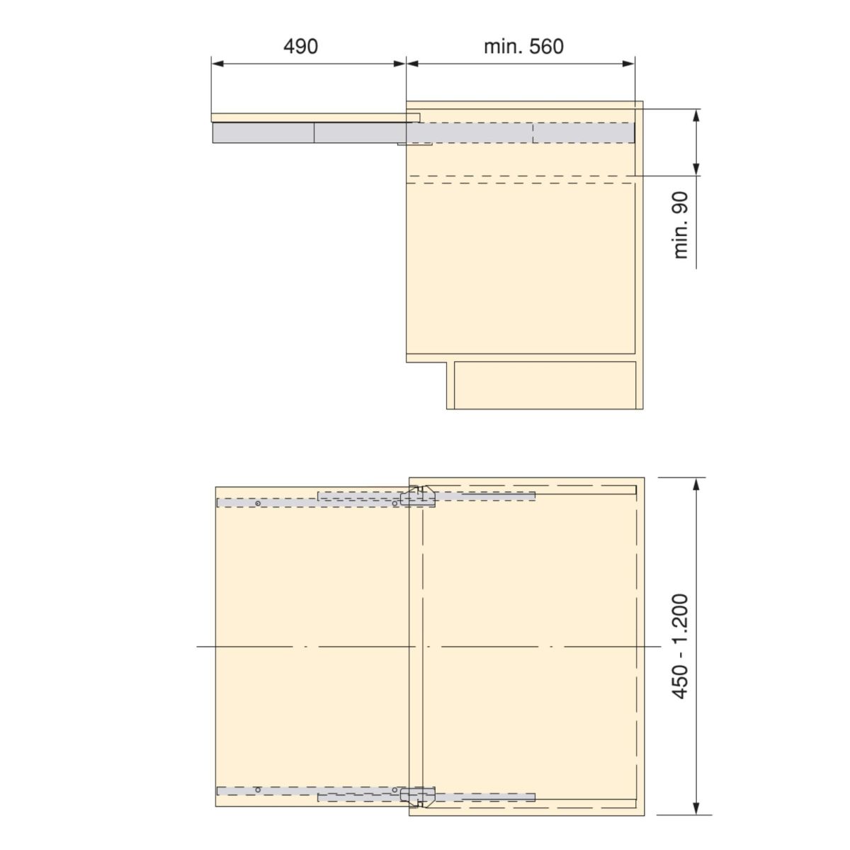 Il sistema deve essere installato in moduli con una larghezza compresa tra 450 e 1.200 mm e con una profondità minima di 560 mm. Le guide del sistema consentono l'estrazione di una superficie di 490 mm e una capacità di carico di 80 kg. Inoltre, hanno un meccanismo di blocco di sicurezza per evitare la chiusura involontaria del tavolo. La tavola che compone il piano di appoggio non è inclusa.