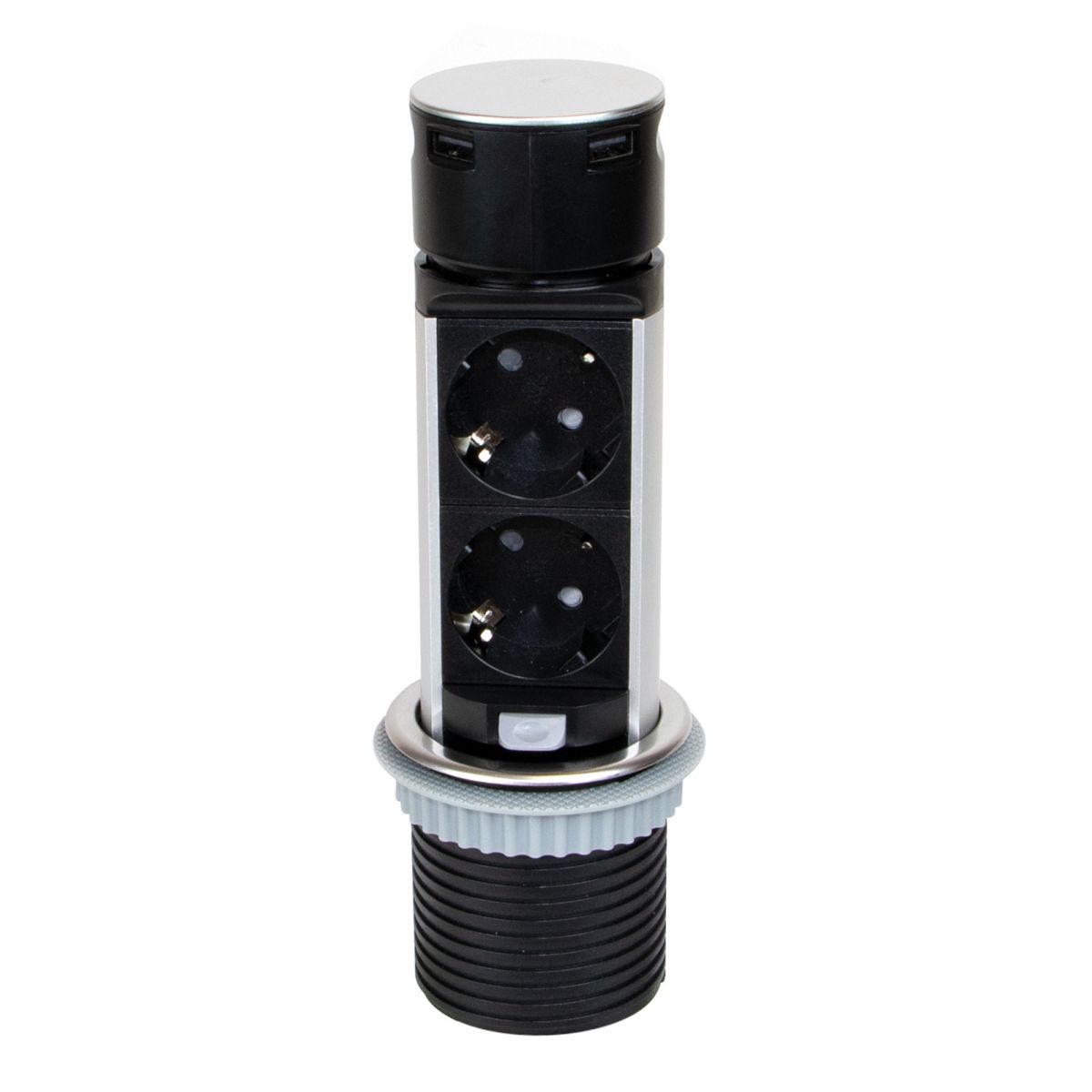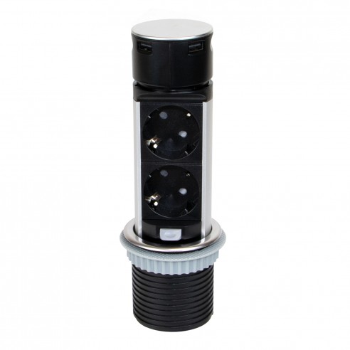 Questo connettore dispone di due prese elettriche tipo F schuko (EU) con una potenza massima ammissibile fino a 3680W - 16A e due connettori USB per la ricarica veloce di dispositivi elettronici 5V DC (1 x 2,4A / 2 x 1,2A) con una potenza massima di 12W. Per utilizzare i connettori USB è sufficiente una leggera pressione sulla superficie in acciaio inossidabile, che li rende entrambi accessibili. Se poi devi utilizzare le prese di corrente, puoi tirare il blocco verso l’alto per renderle accessibili.