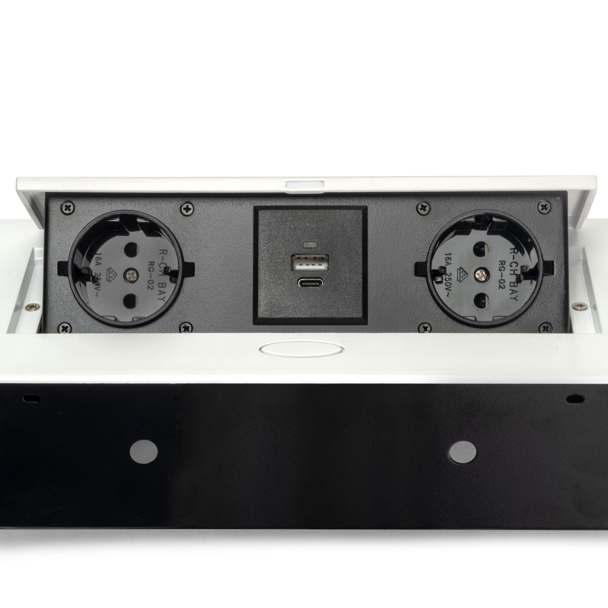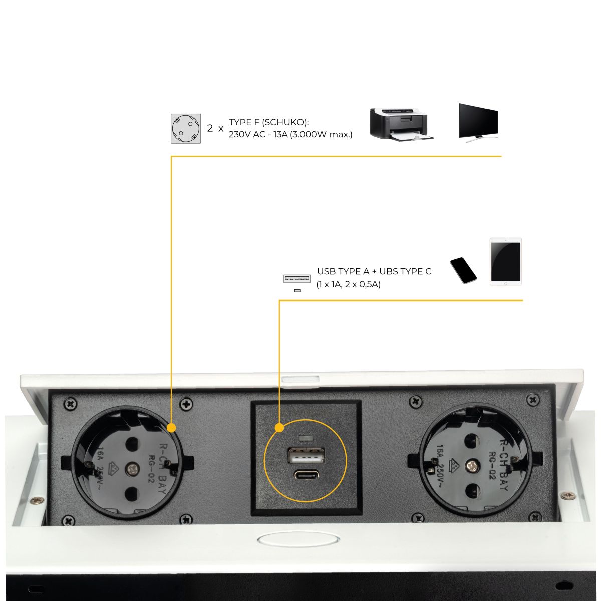 Dispone di due spine tipo F Schuko (UE) con una potenza massima ammissibile fino a 3.000 W - 13 A e due connettori USB tipo A e tipo C per carica dispositivi elettronici 5V DC (1 x 1A / 2 x 0,5A). È dotato di un pulsante, coperchio auto sollevante per un facile accesso ai connettori e un discreto indicatore di alimentazione a LED.