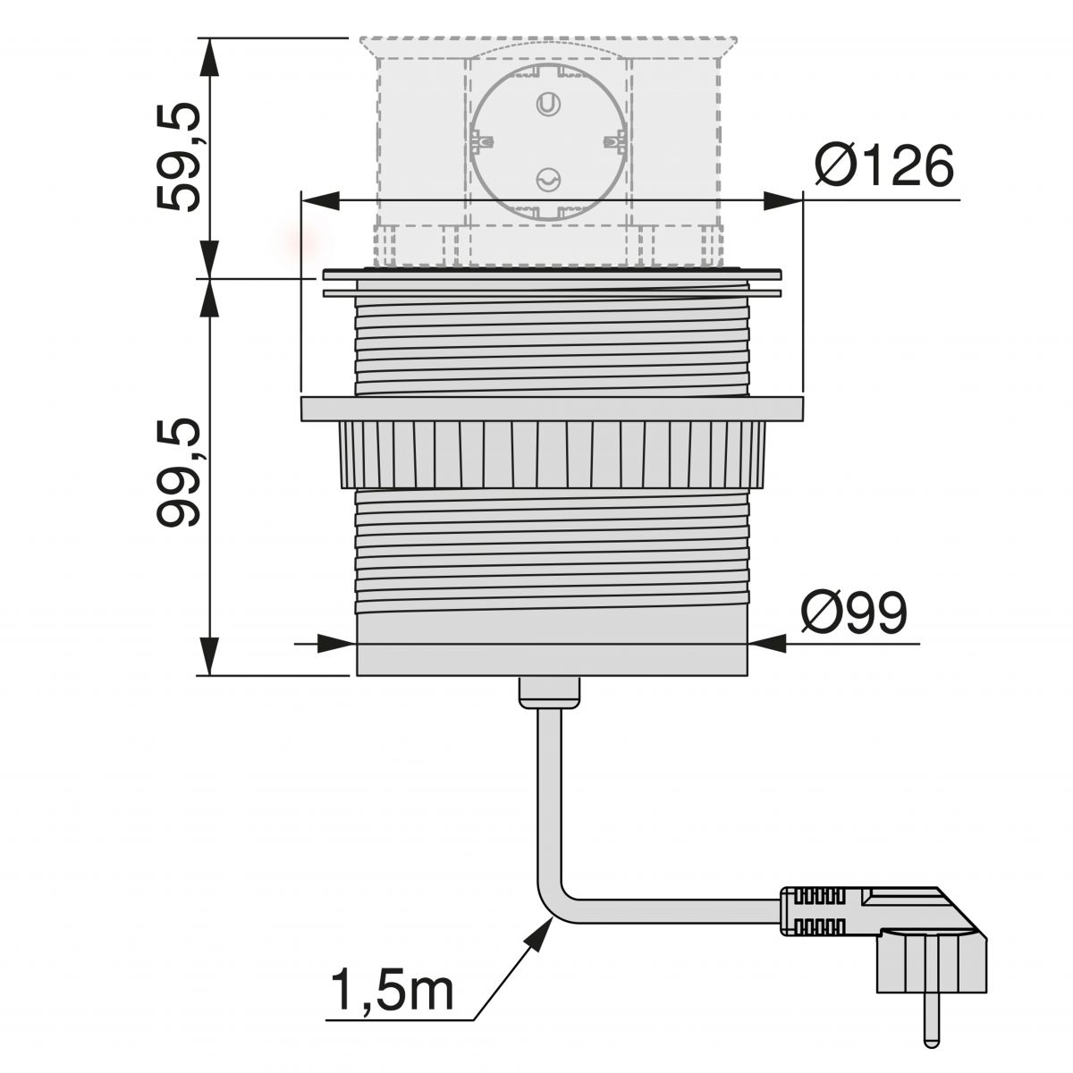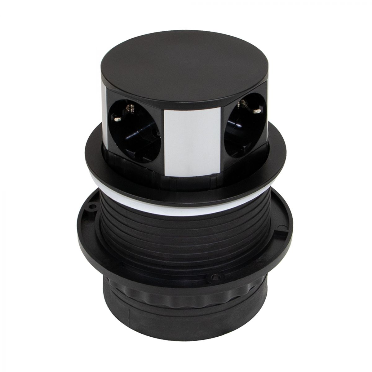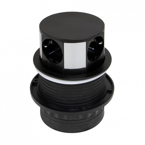 Questo connettore dispone di 3 prese elettriche tipo F schuko (EU) con una potenza massima ammissibile fino a 3680W - 16A e 2 connettori USB per la ricarica veloce di dispositivi elettronici 5V DC (1 x 2,4A / 2 x 1,2A) con una potenza massima di 12W. Si caratterizza per l’estrazione simultanea del blocco delle connessioni (prese di corrente e connettori USB) con un’unica leggera pressione sulla parte superiore del multiconnettore. Il coperchio superiore è realizzato con una finitura nero opaco.