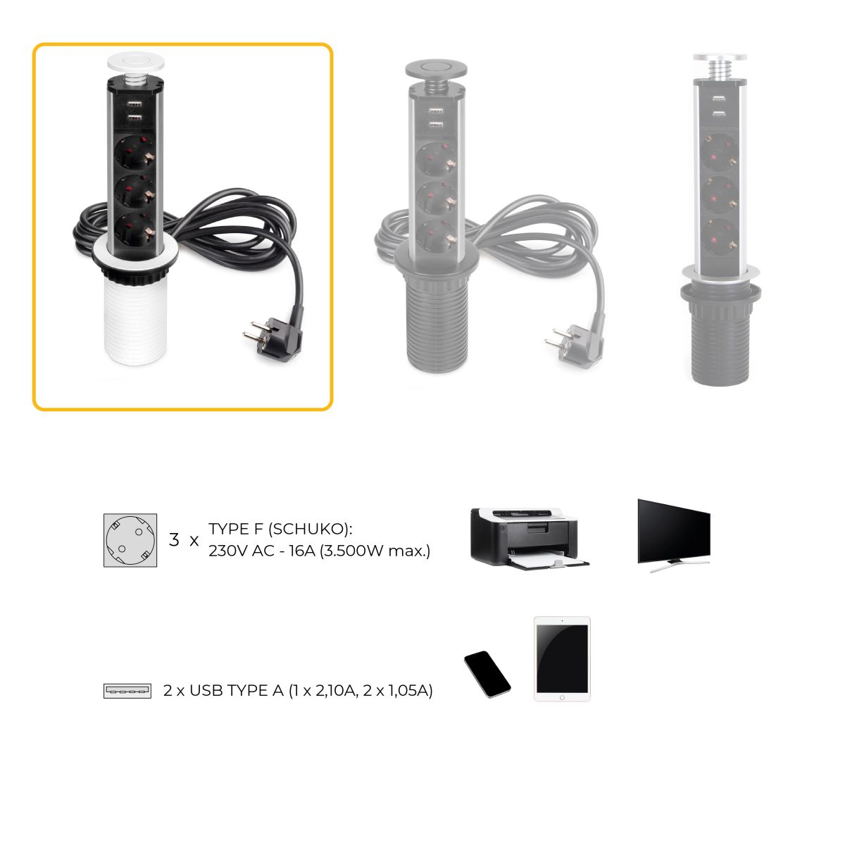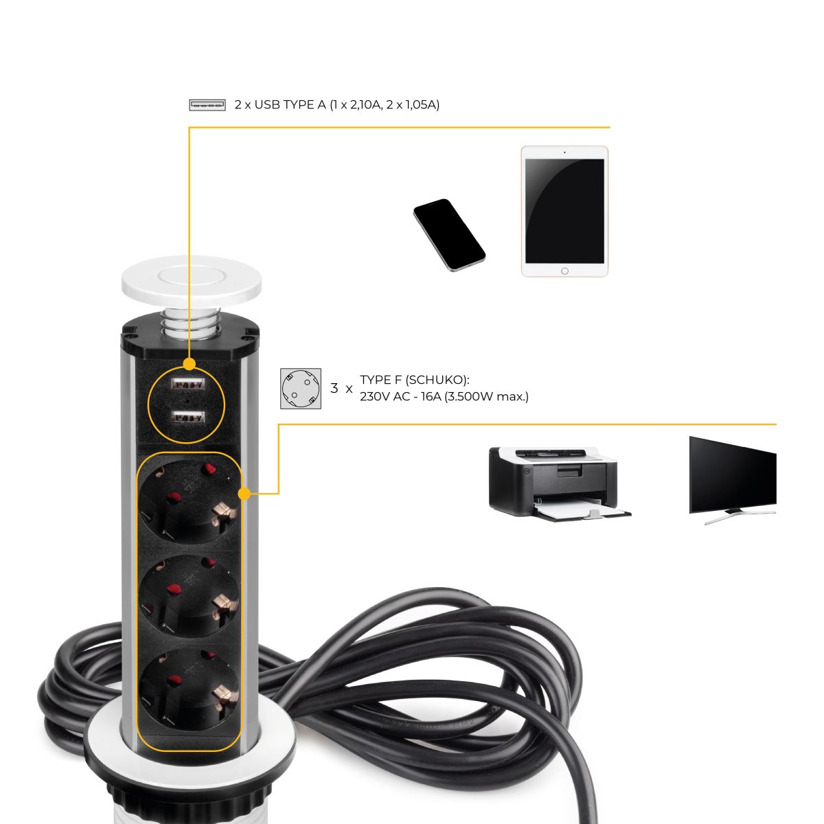 Dispone di tre prese tipo Schuko con una potenza massima ammissibile fino a 3500W – 16A e di due connettori USB per caricare dispositivi elettrici 5V DC (1 x 1A / 2 x 0,5A) ideale per caricare smartphone e tablet.