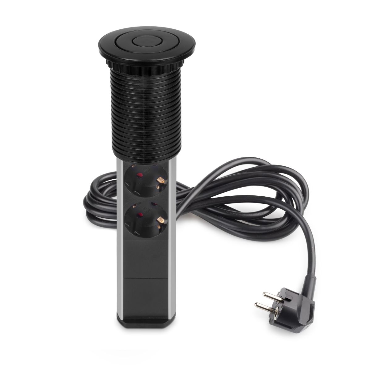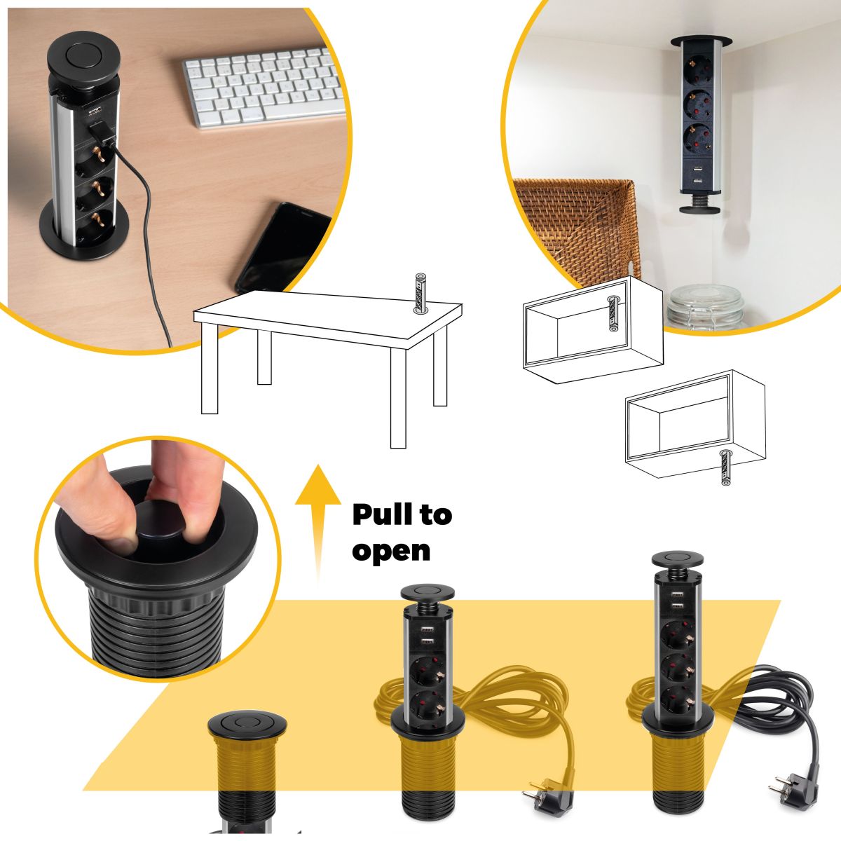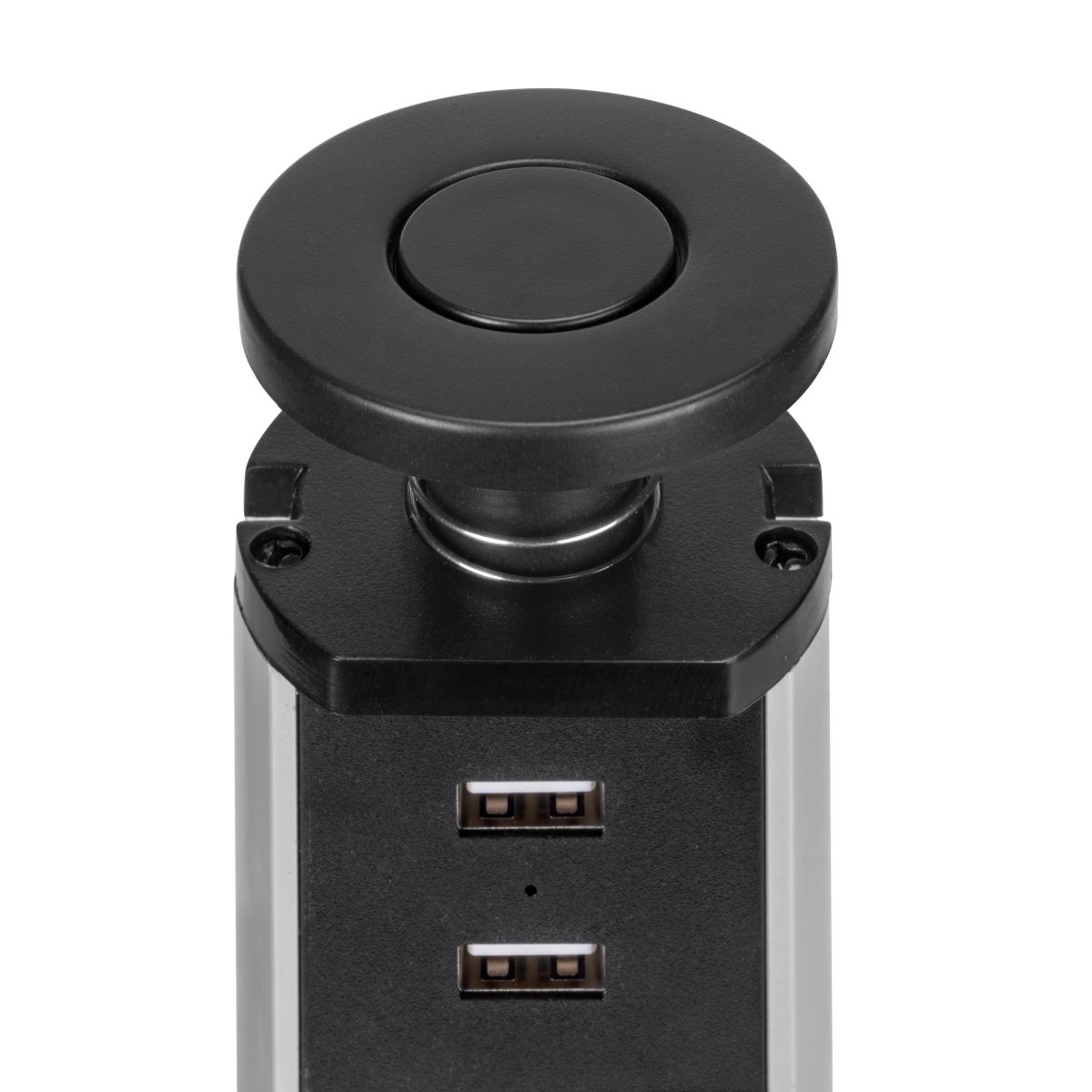 Connettore multipresa o torretta di prese estraibile, progettato per apportare funzionalità con la sua completa integrazione nell'arredo per la casa e dell'ufficio. E' pensato per essere incassato tanto nei moduli alti come in quelli bassi grazie al suo design di facile estrazione e occultazione manuale. Si adatta perfettamenteo alle scrivanie già provviste di passacavi.