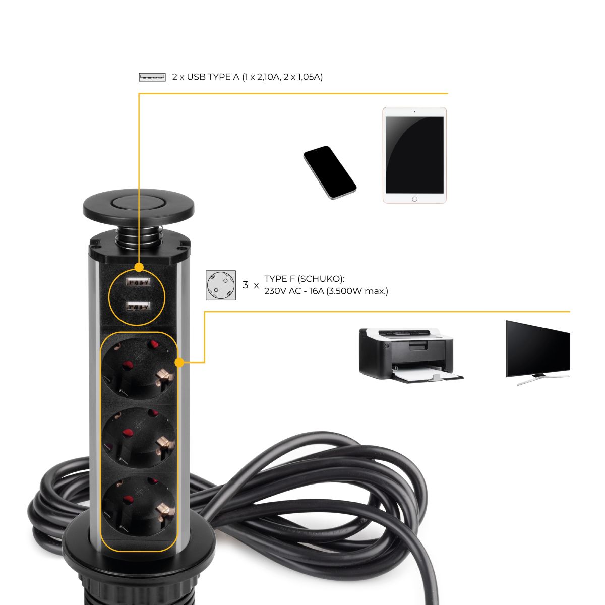 Dispone di tre prese tipo Schuko con una potenza massima ammissibile fino a 3500W – 16A e di due connettori USB per caricare dispositivi elettrici 5V DC (1 x 1A / 2 x 0,5A) ideale per caricare smartphone e tablet.