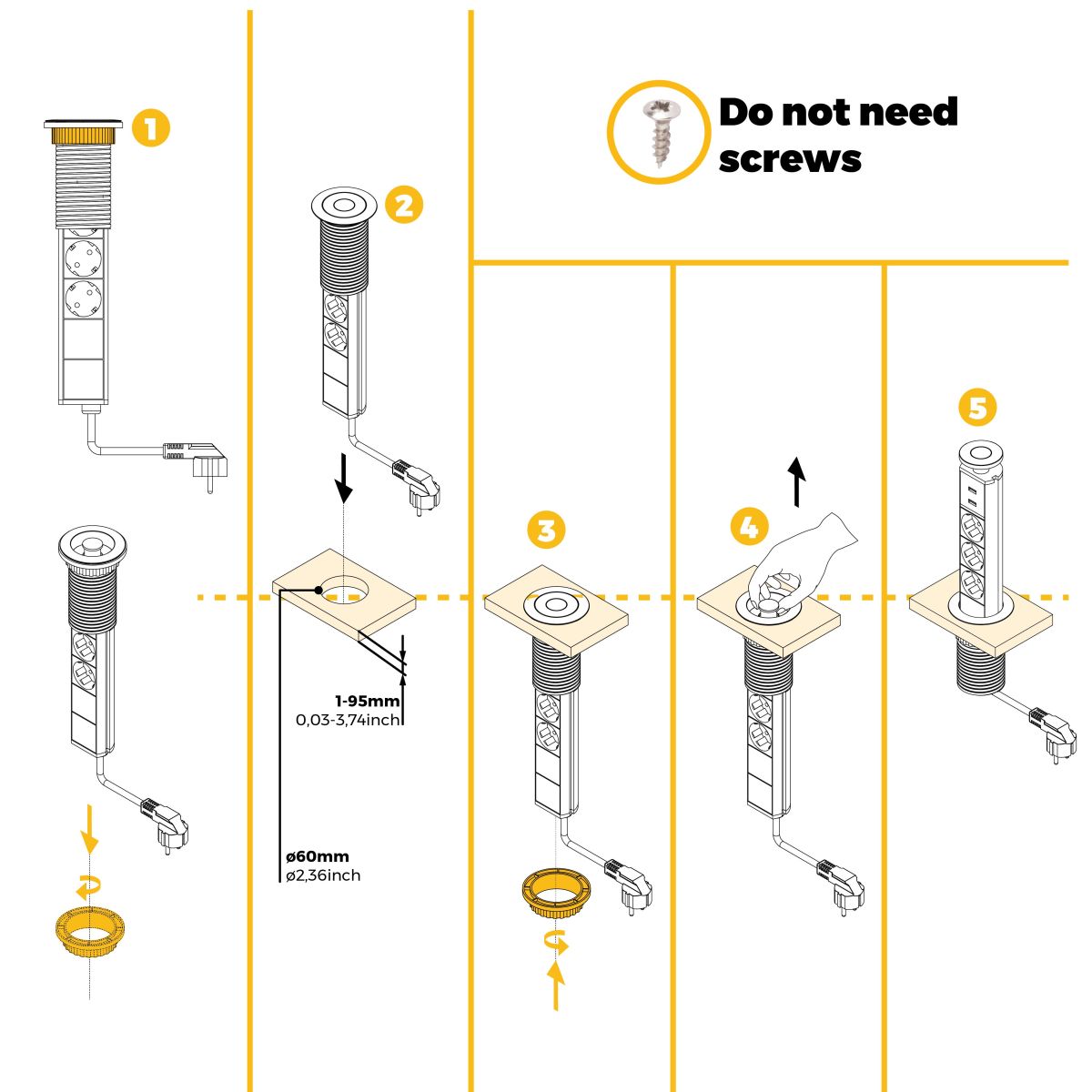 La sua istallazione è molto versatile, richiede solo un foro D. 60 mm ed ha la possibilità di essere montato in superfici di grande spessore, tra 1 e 95 mm. Inoltre si fissa al mobile senza necessità di ferramenta grazie a una bussola di fissaggio manuale. Dispone di un discreto indicatore LED di accensione e un cavo di 1,8 mt con presa per il funzionamento a 230V AC 50Hz.