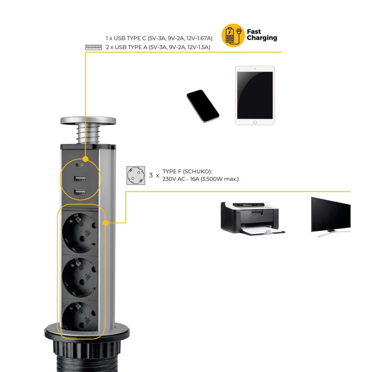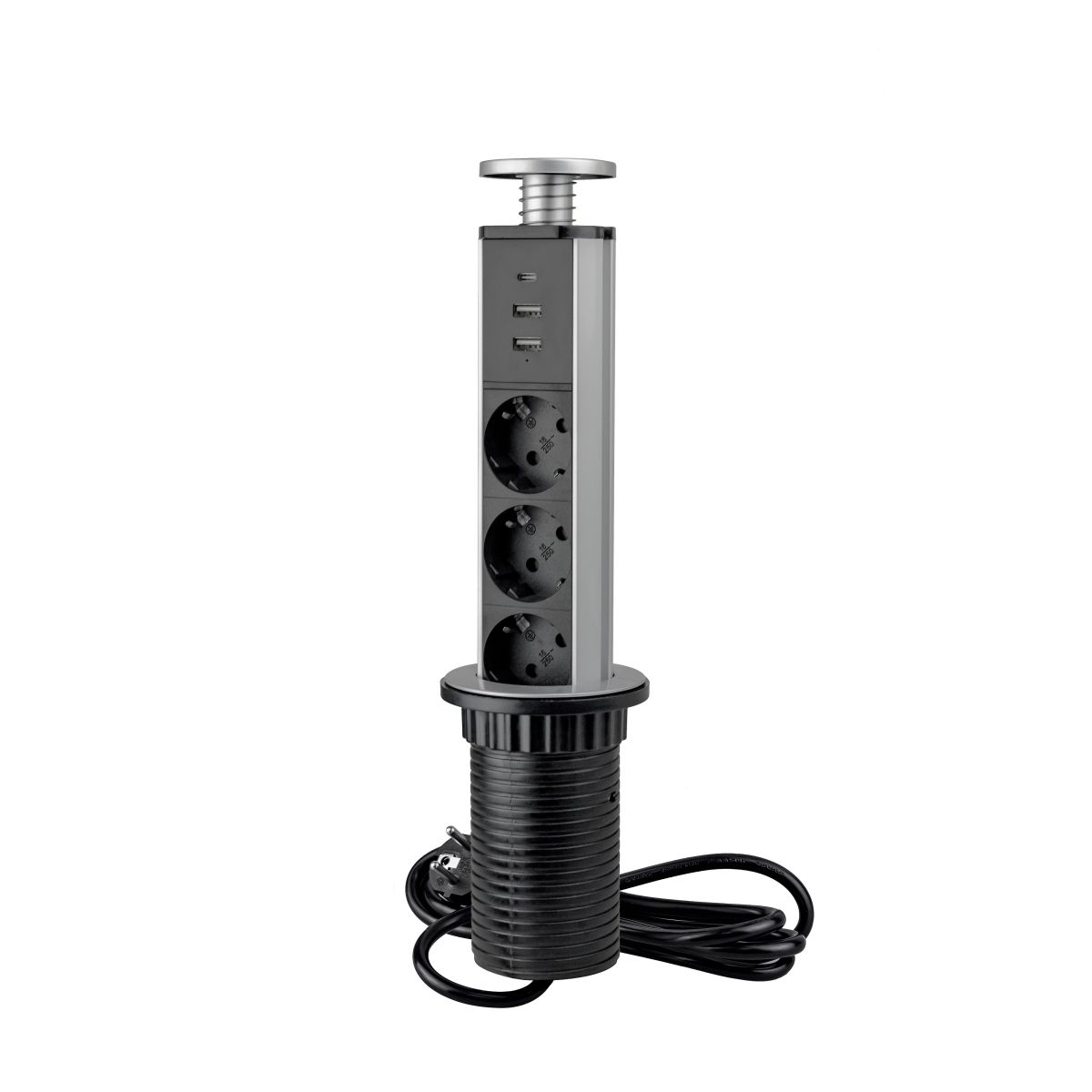 Emuca Multipresa estraibile Vertikal, 3 prese Schuko, 1 USB Tipo A, 1 USB Tipo C, Tecnoplastica e Alluminio, Grigio metallizzata