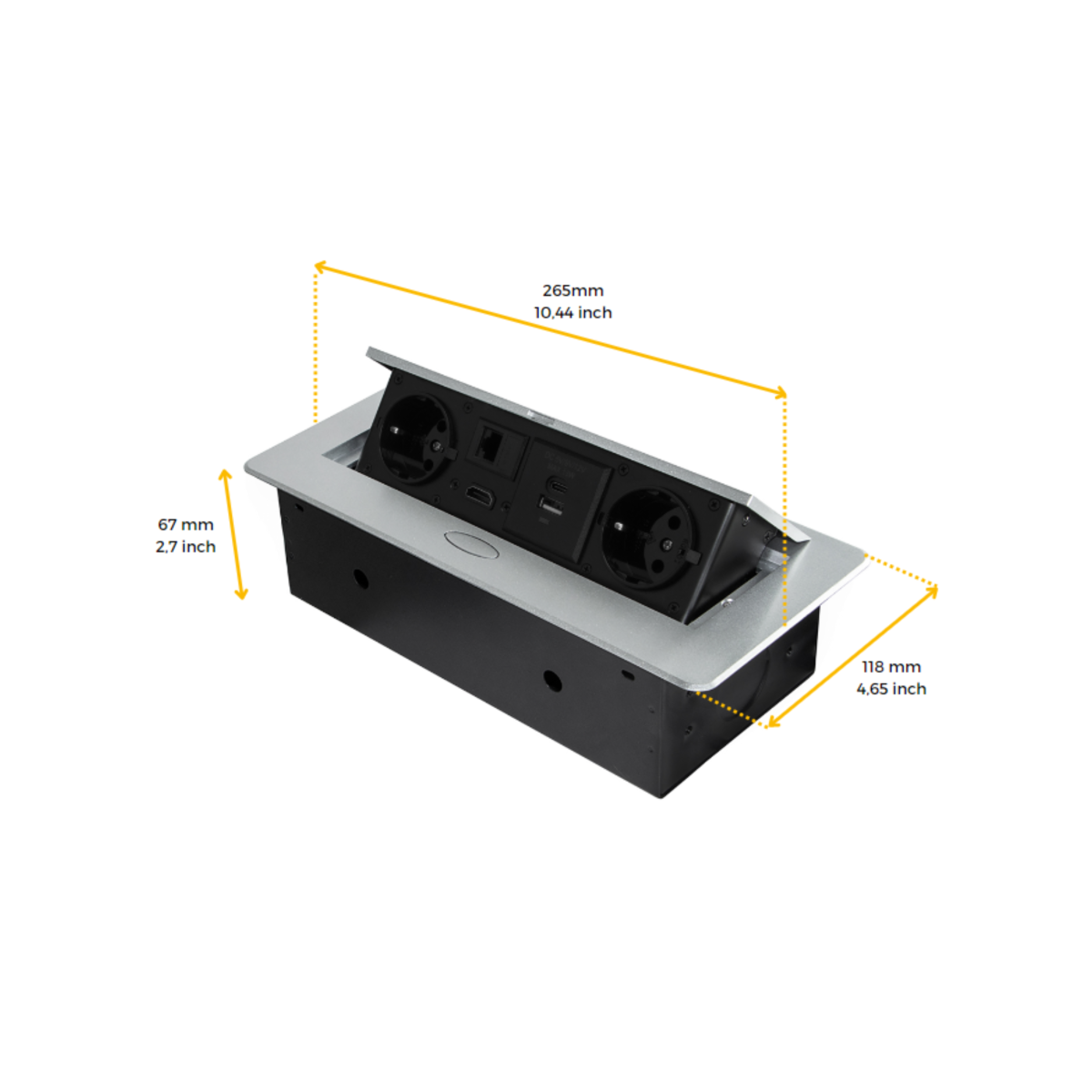 Ha 2 spine Schuko tipo F (EU) con una potenza massima ammissibile fino a 3.000W - 13A, 1 connettore HDMI, 1 porta di rete RJ45 non schermata, 1 connettore USB A e 1 connettore USB C (1x3A, 2x1 . 5A) ricarica rapida e con campo di applicazione di 5V 3A, 9V 2A, 12V 1,5 A.