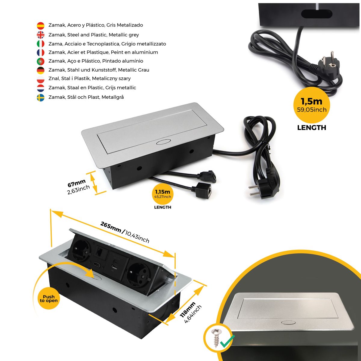 Emuca Multiconnettore Atom 26, 225x111mm, 2 prese Schuko, 1 USB tipo A, 1 USB tipo C, 1 RJ45, 1 HDMI, Zama-Acciaio-Plastica